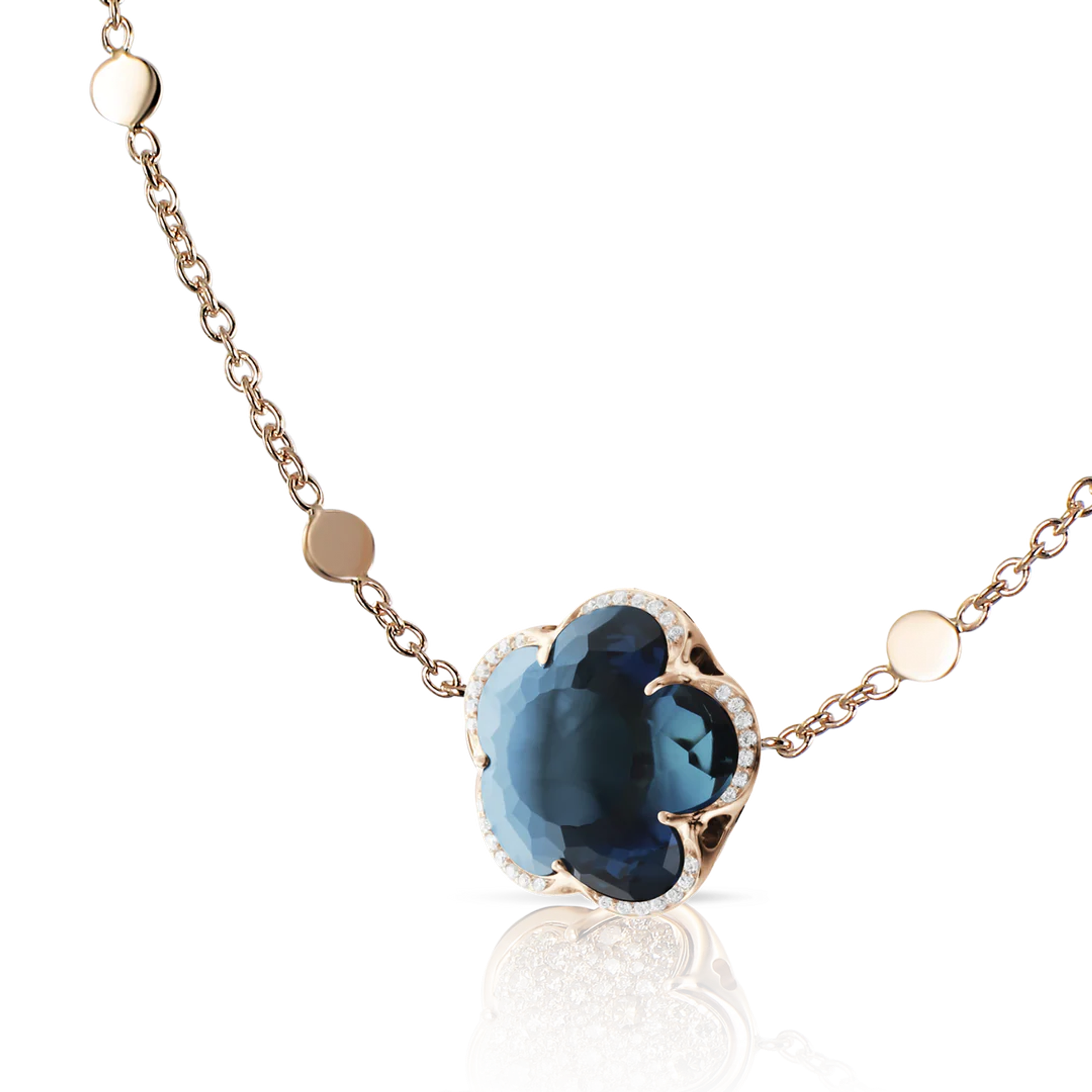 Halskette aus 18K Roségold. Länge der Kette 43 cm. London Blue Topas in Blumenform mit einem Durchmesser von 14 mm. Gesamtgewicht der Diamanten 0,09 ct.