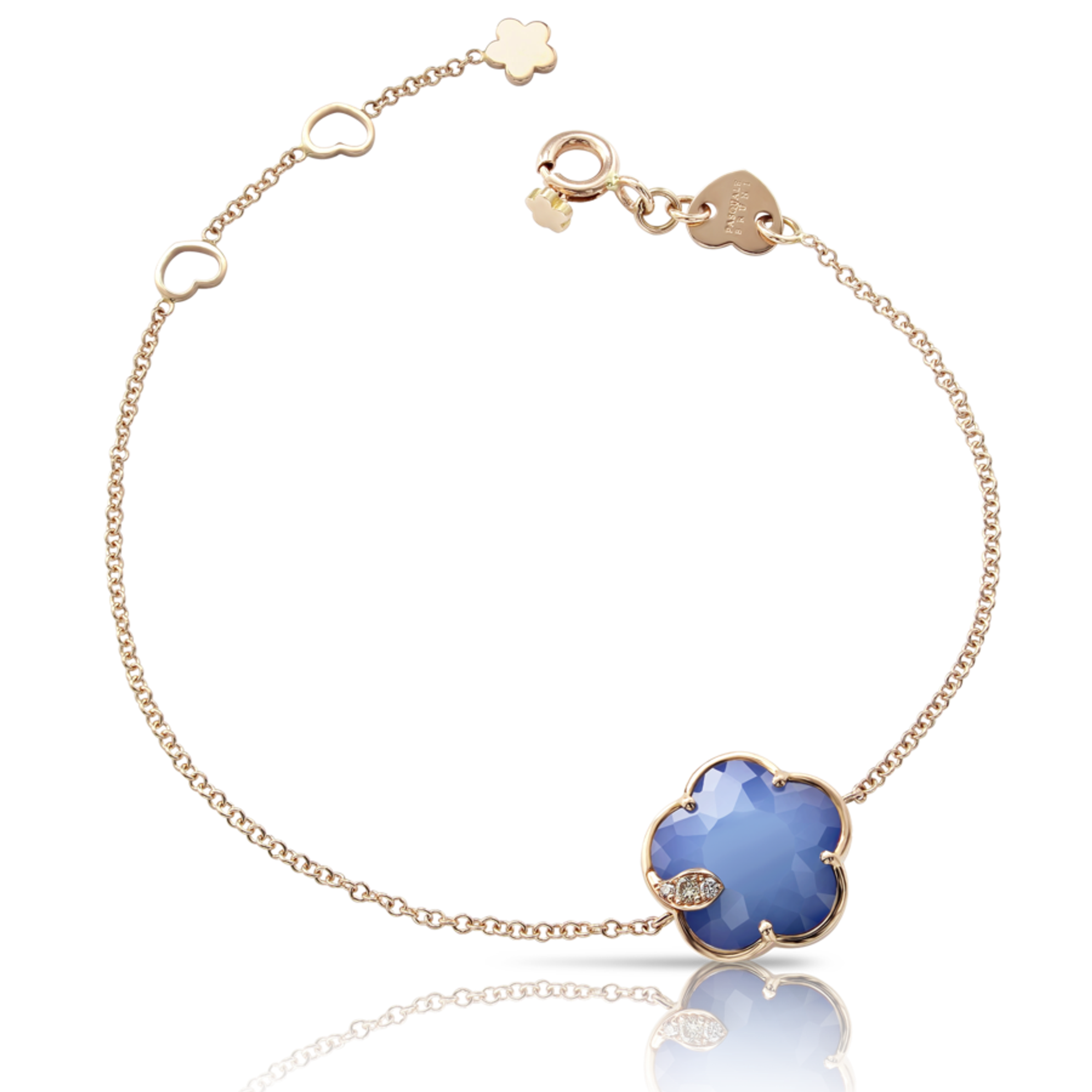 Armband aus 18-karätigem Roségold. Länge 18,5 cm. Dublett aus weißem Achat und Lapislazuli in Blumenform mit einem Durchmesser von 12 mm. Diamanten: weiß – 0,01 ct, champagne – 0,03 ct.