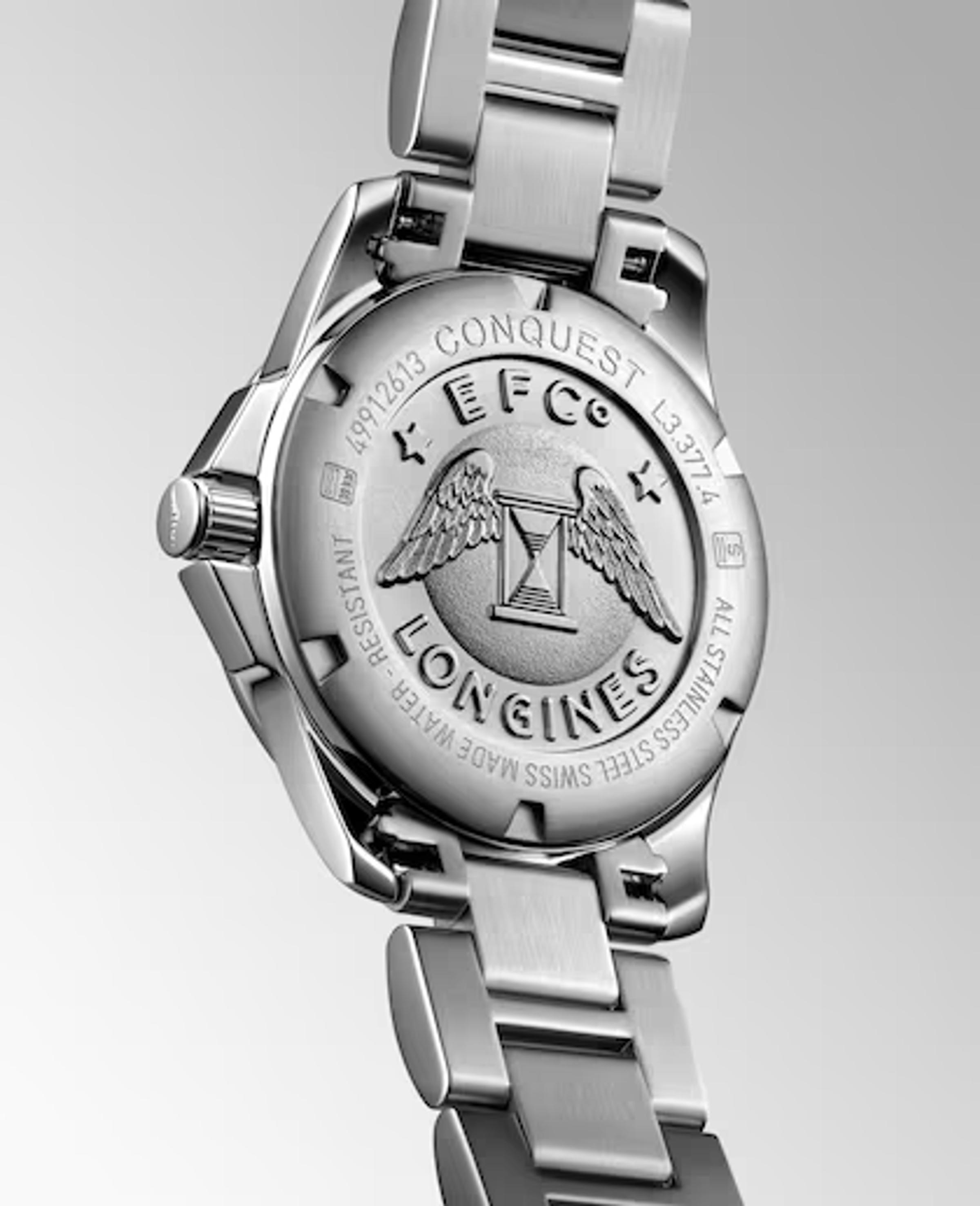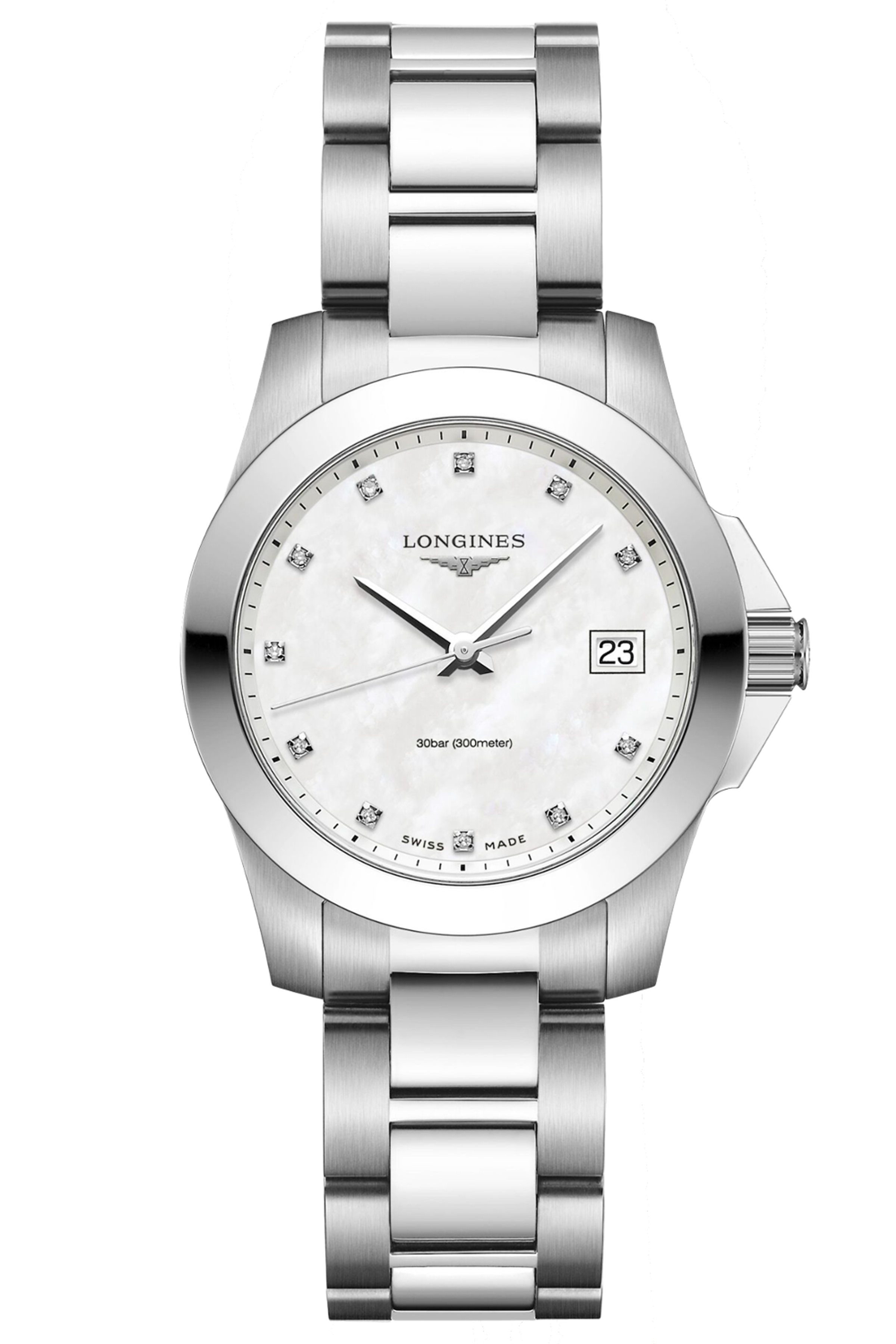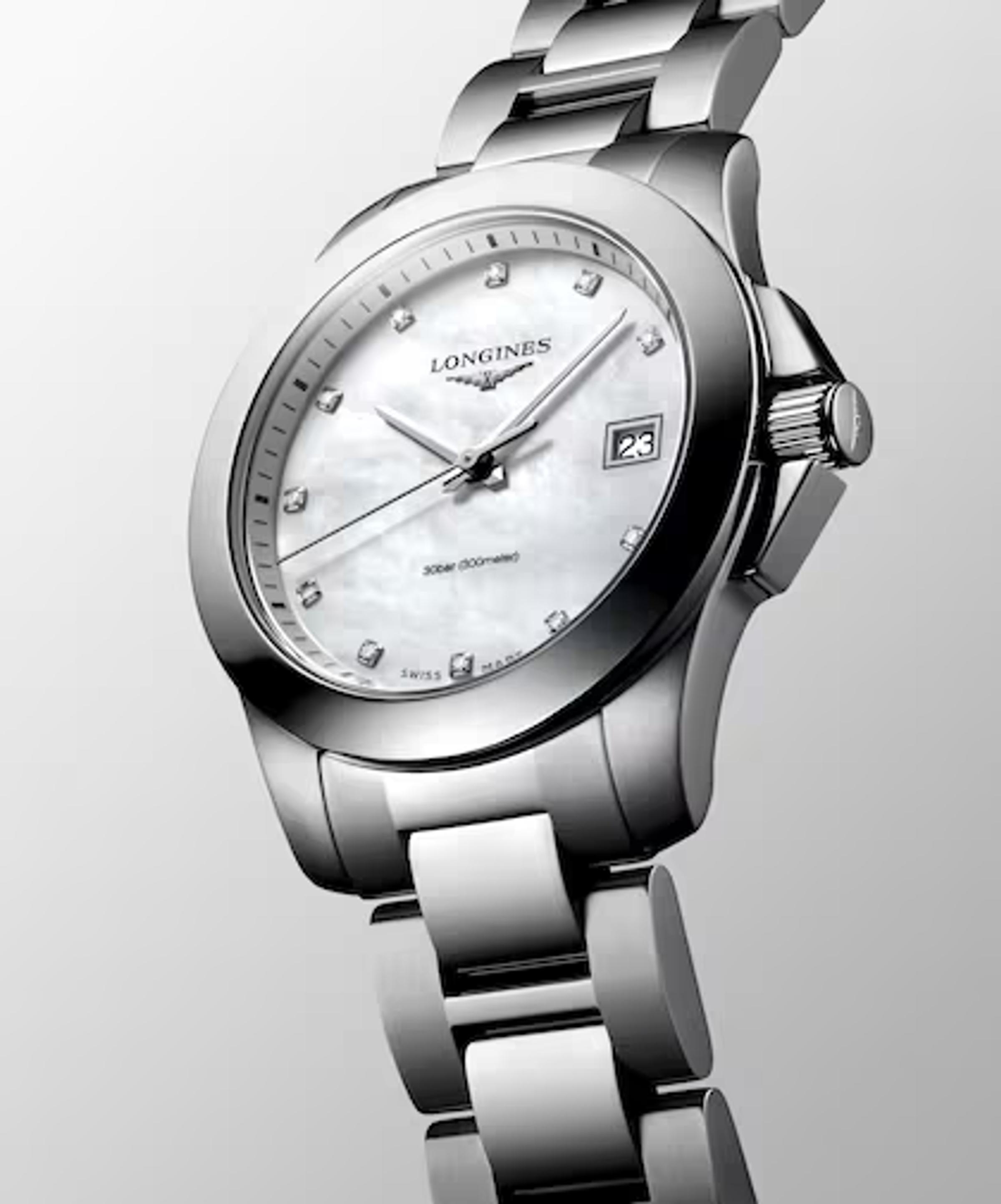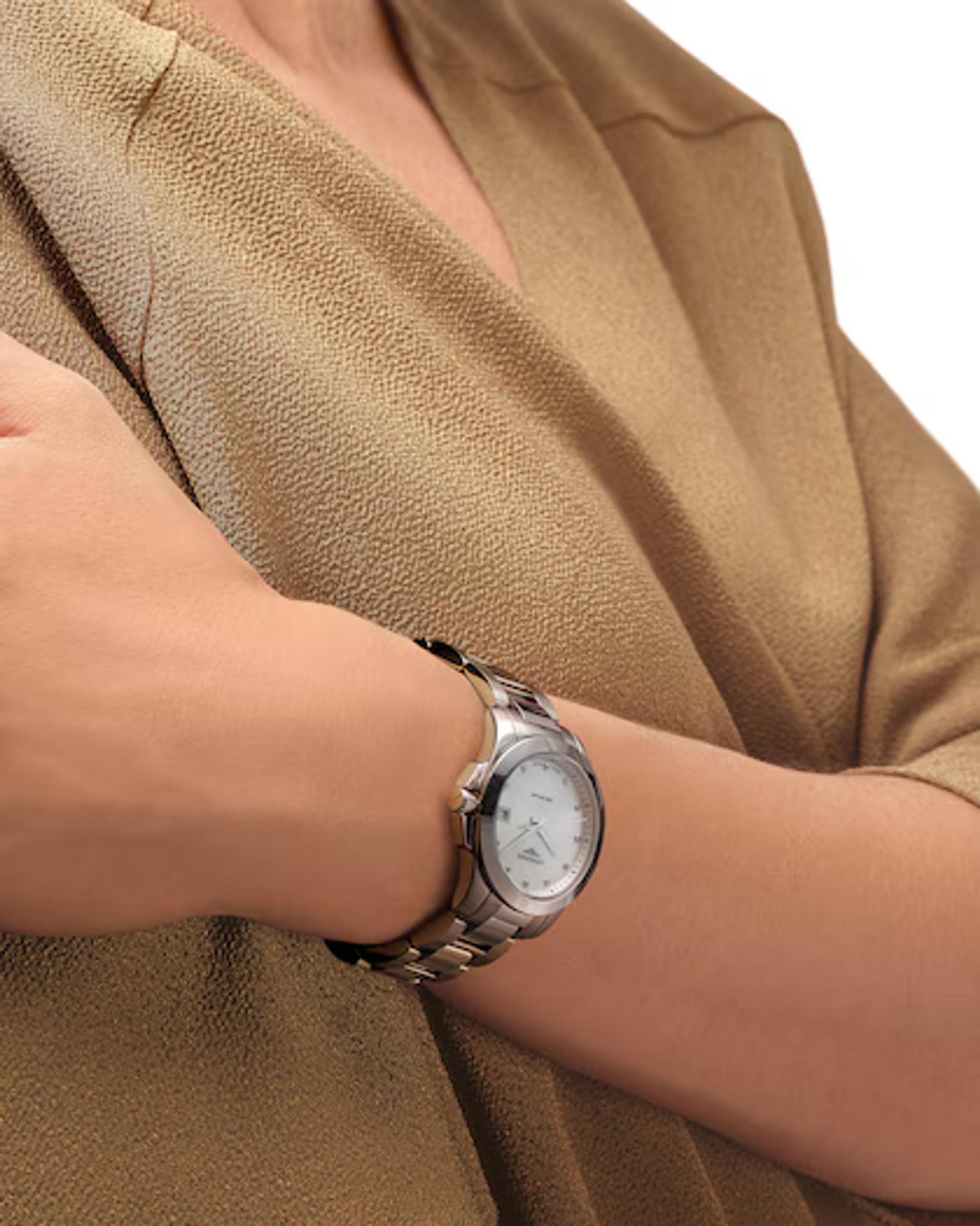 Damenquarzuhren, Gehäuse – Edelstahl, 34 mm. Zifferblatt – natürliche Perlmutt. Armband – Edelstahl, Gesamtgewicht der Diamanten 0,036 ct VS-SI. Anzeige für das Ende der Batterielebensdauer.