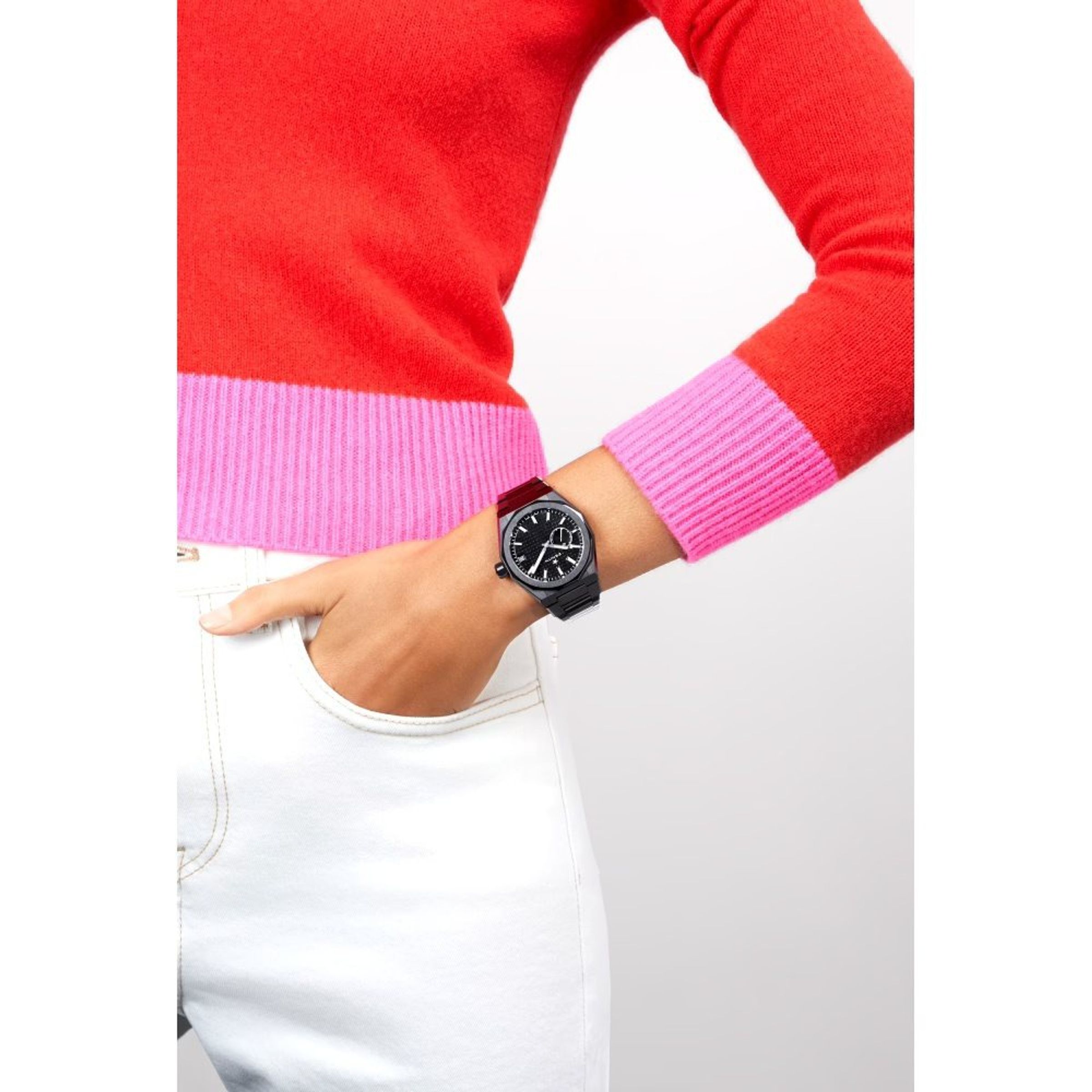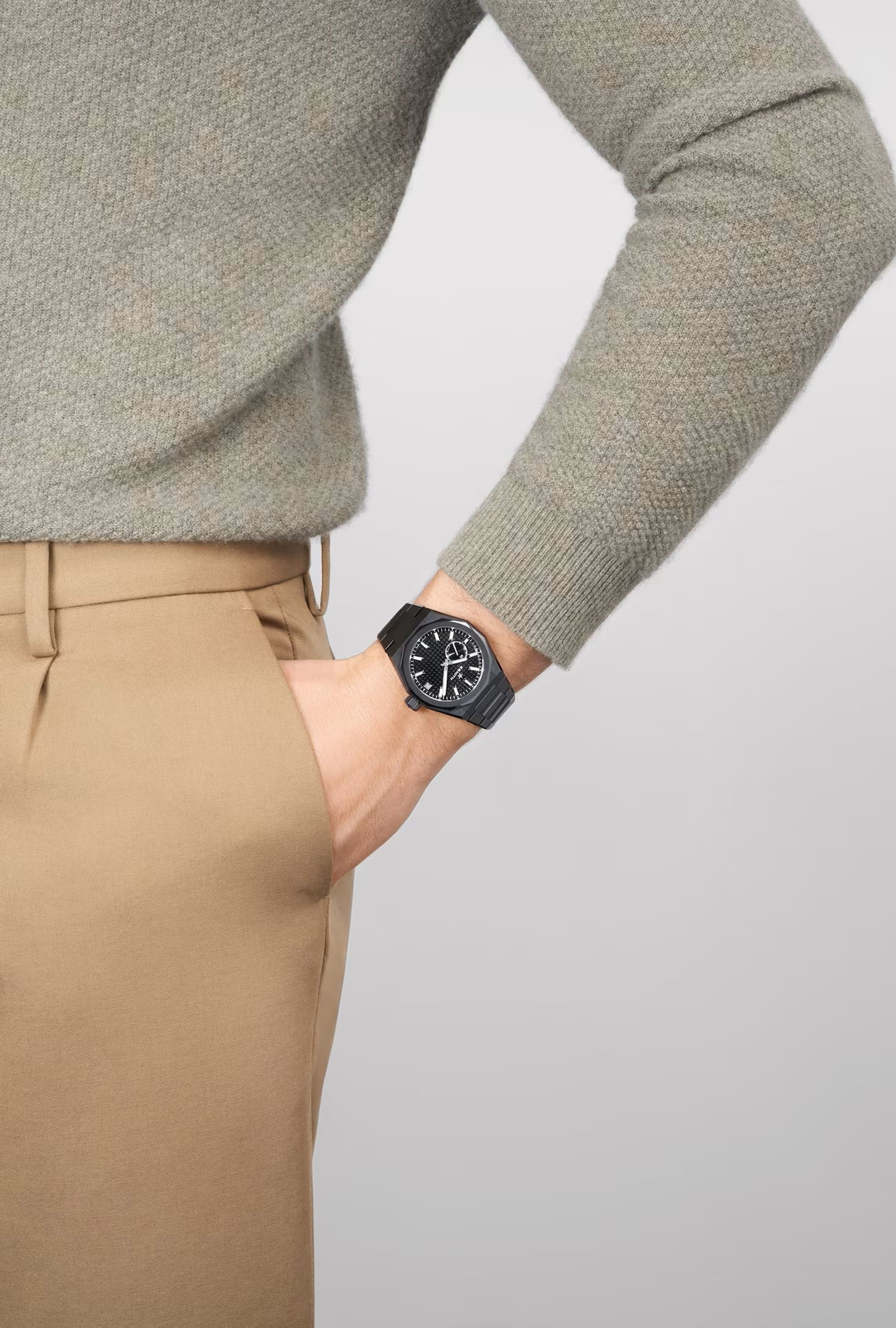 Automatische Unisex-Uhr. Gehäuse - Keramik, 41 mm. Ein austauschbares Keramik-Armband + ein schwarzes gemustertes Gummiarmband sind im Lieferumfang enthalten.