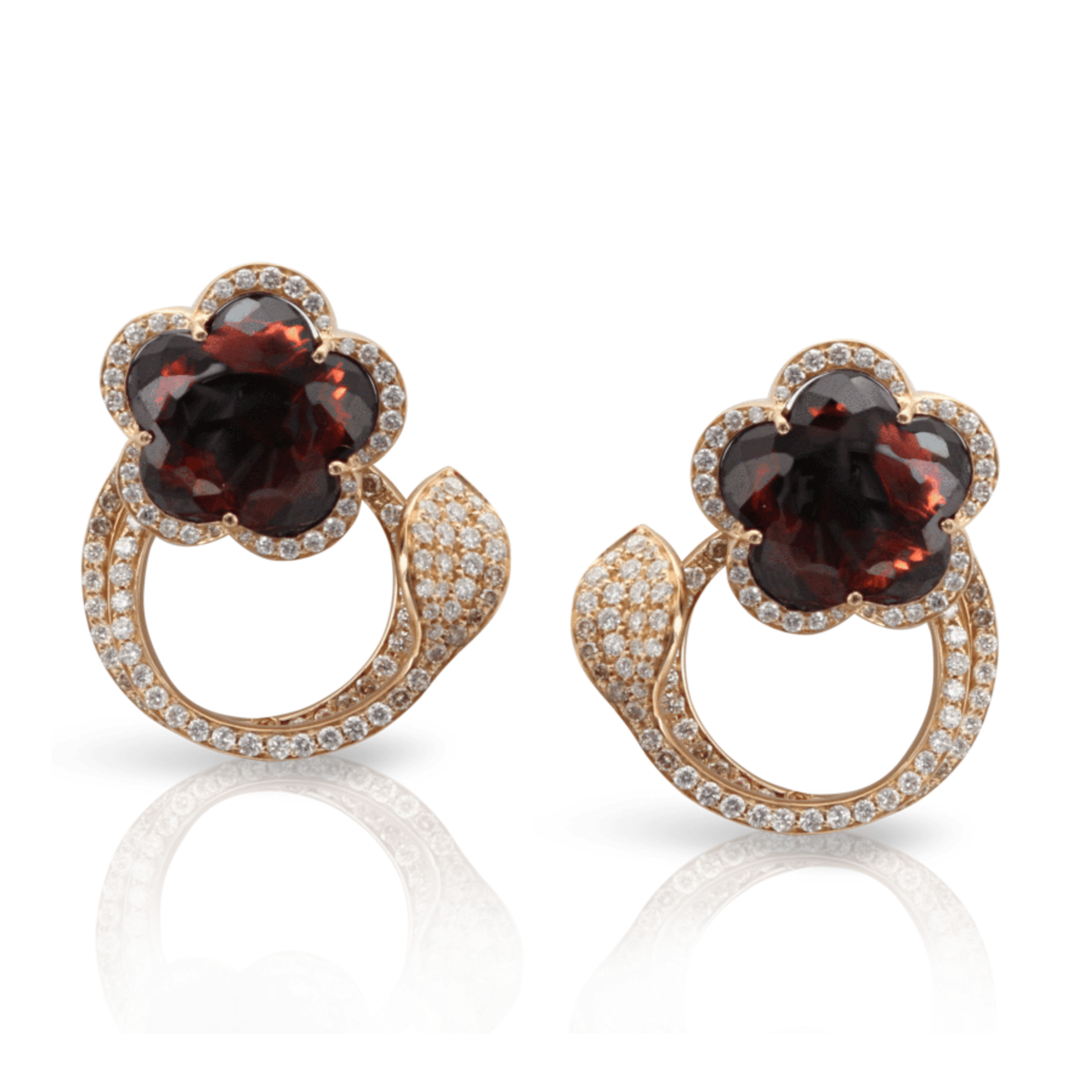 Ohrringe aus 18K Roségold. Roter Granat mit einem Durchmesser von 12 mm, weiße und champagnerfarbene Diamanten.