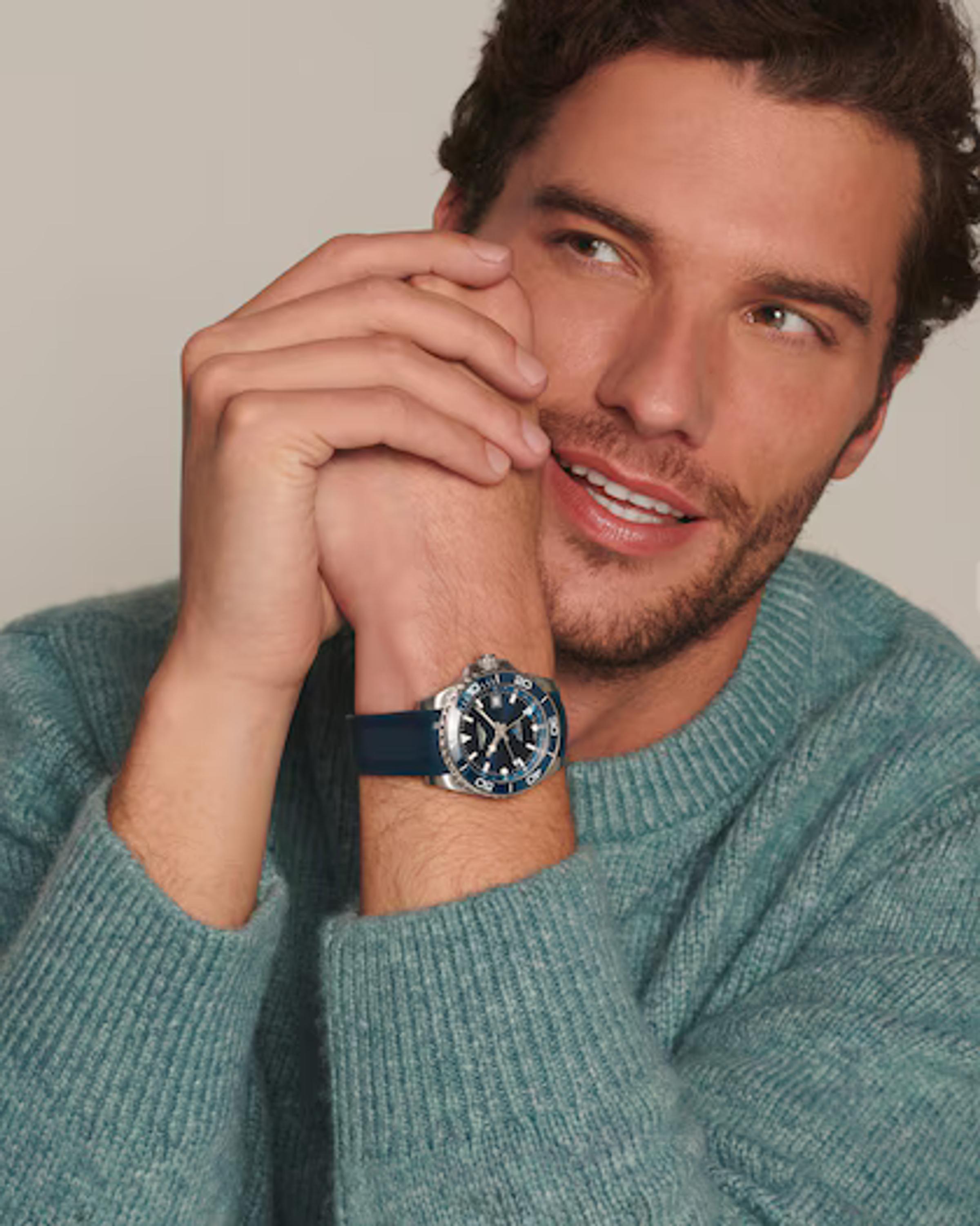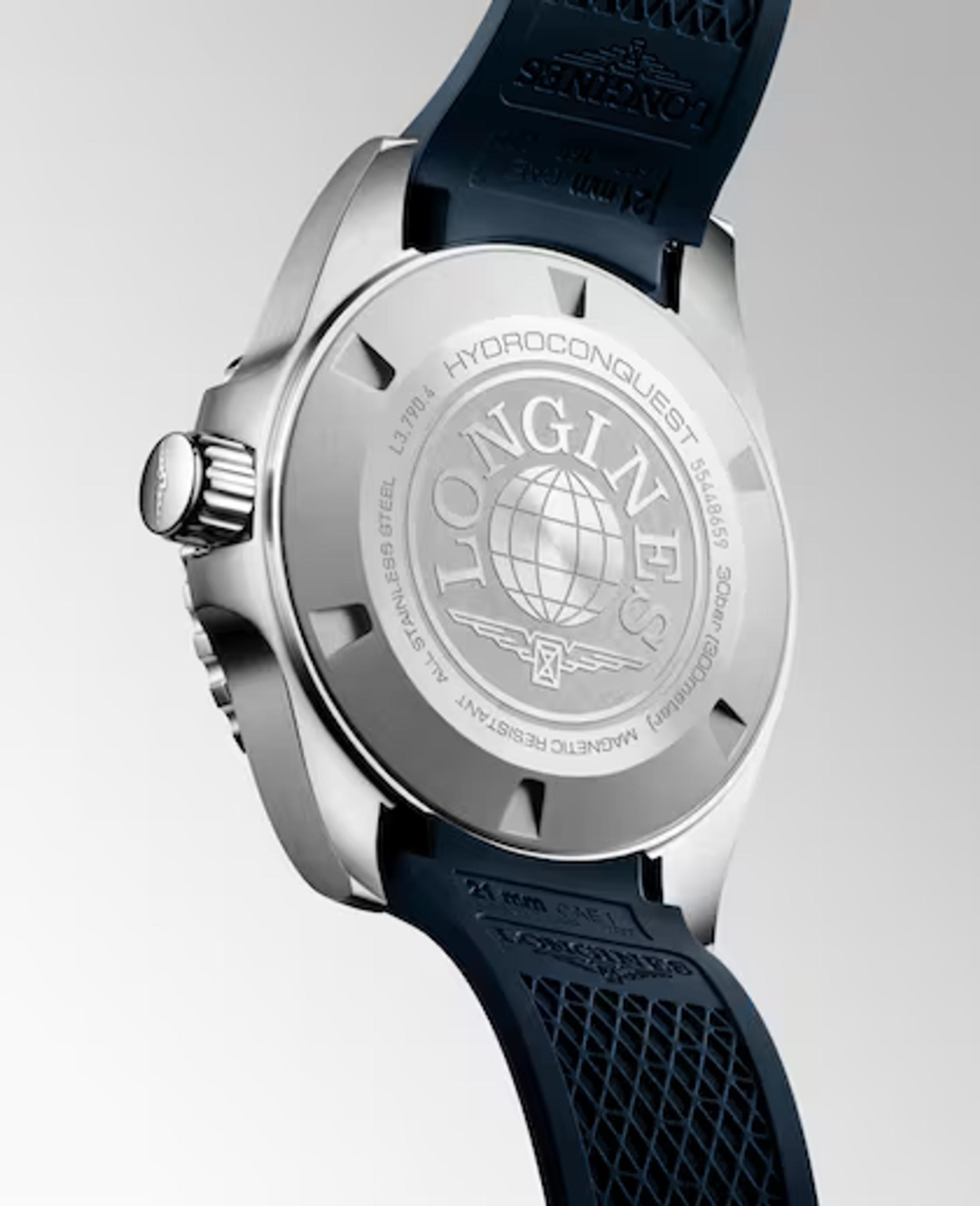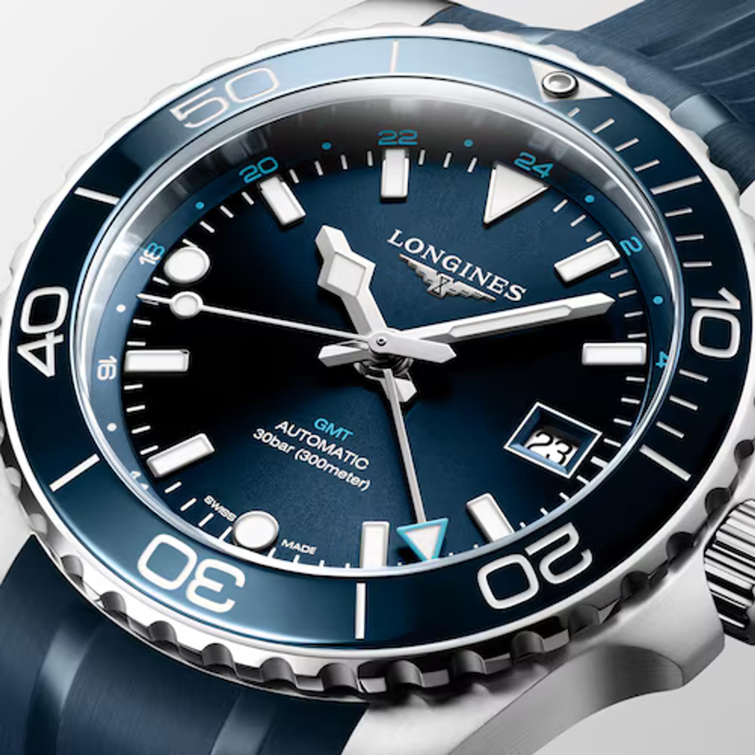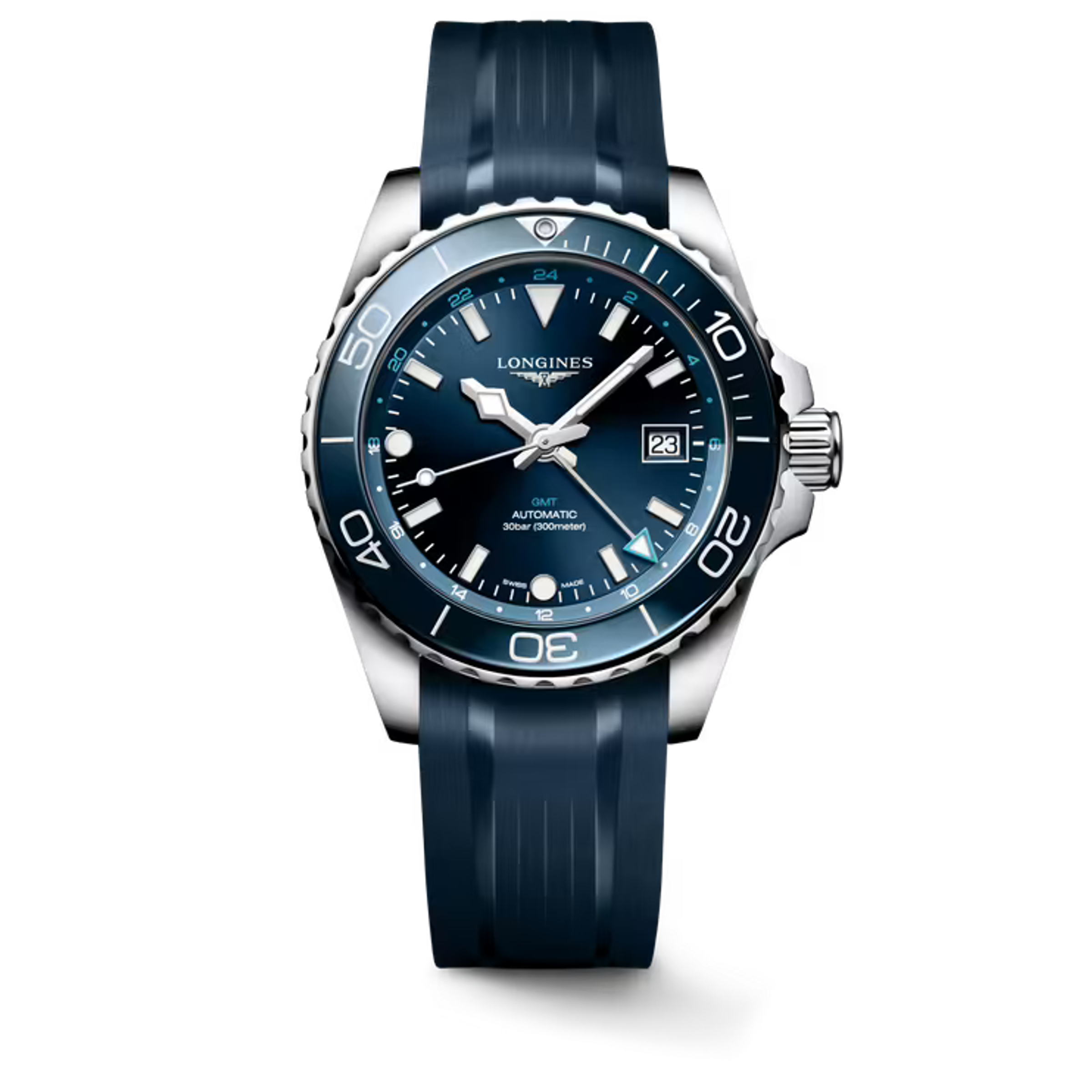 Herrenarmbanduhr von Longines mit automatischem Uhrwerk. Gehäuse – Edelstahl, Lünette – Keramik, 41 mm. Armband – Kautschuk, Schließe mit doppelter Sicherheits-Faltschließe.