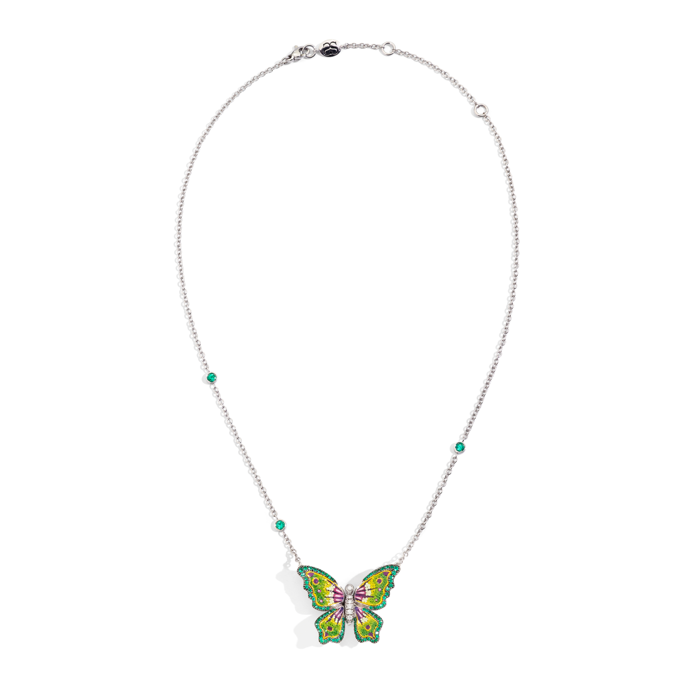 Damenhalskette aus 18K Weißgold. Gesamtgewicht: Diamanten - 0,08 ct und Smaragde - 0,75 ct.