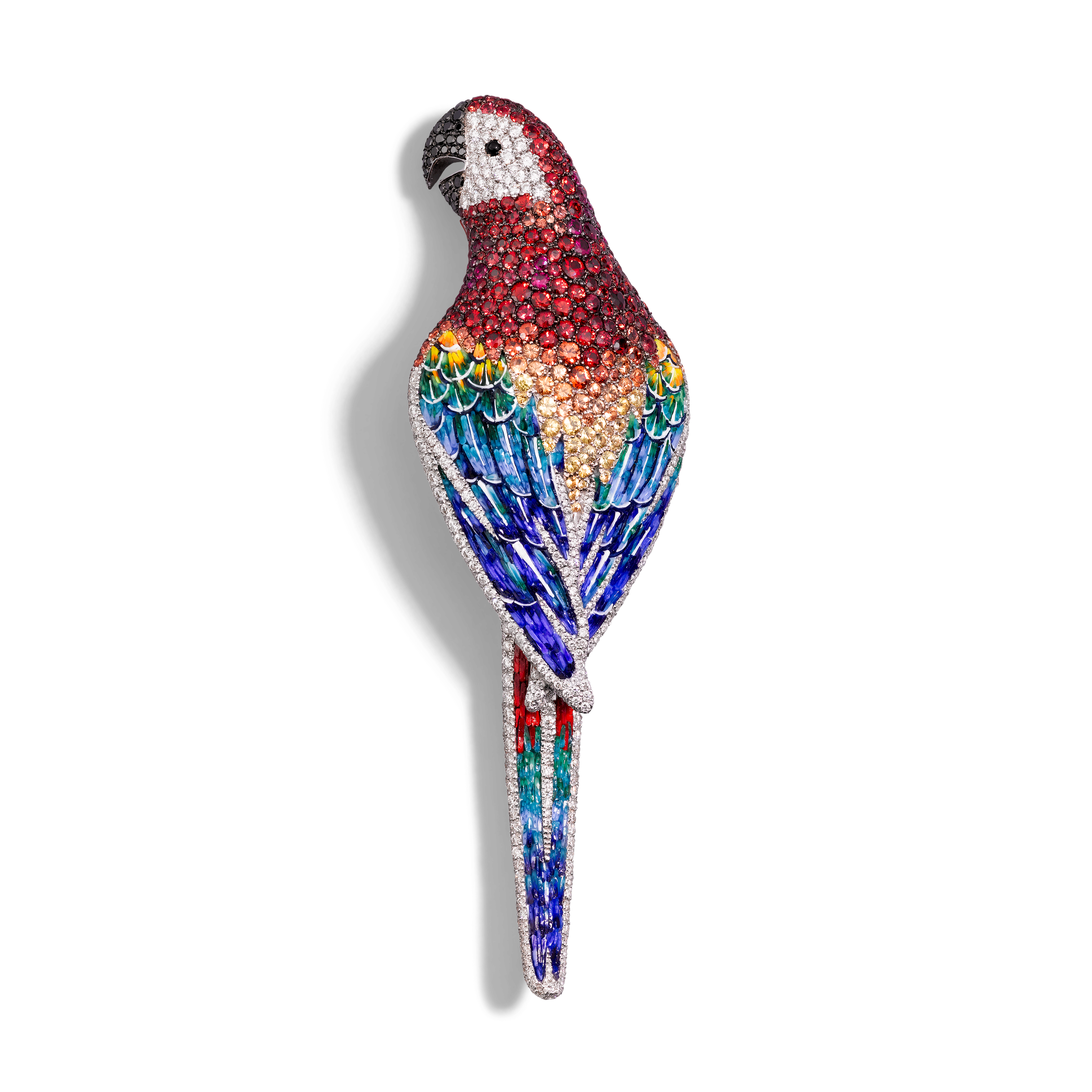 Damenanhänger aus 18K Weißgold. Weiße Brillanten 4,14 ct. Schwarze Brillanten 0,60 ct. Gelbe Saphire 0,70 ct. Orange Saphire 8,47 ct. Rubine 1,18 ct. Karneole 39,75 ct. Onyx 2,00 ct.