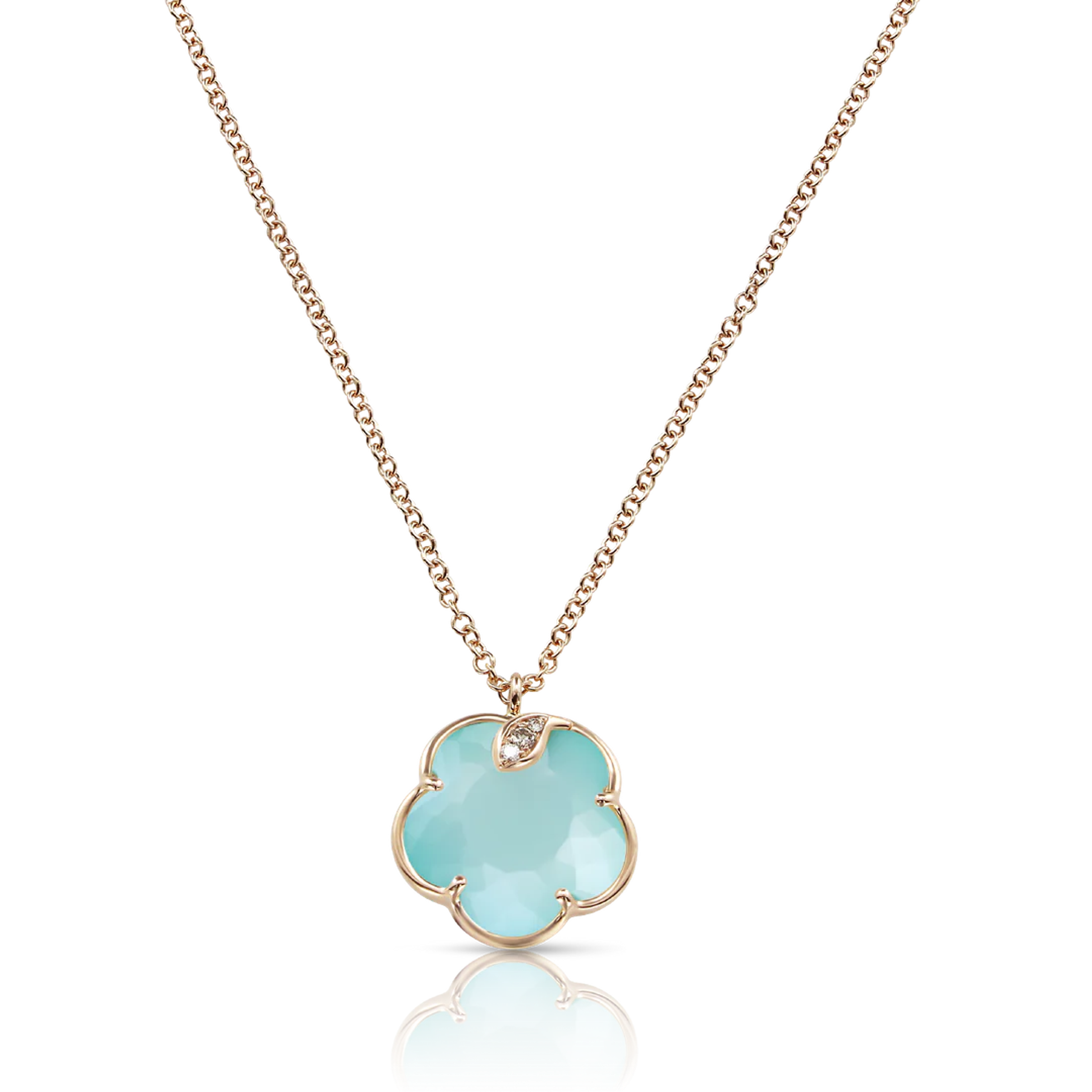 Halskette aus 18-karätigem Roségold. Länge der Kette 42 cm. Dublette aus Türkis und Mondstein in Blumenform mit einem Durchmesser von 12 mm. Diamanten: weiß – 0,01 ct, champagne – 0,03 ct.