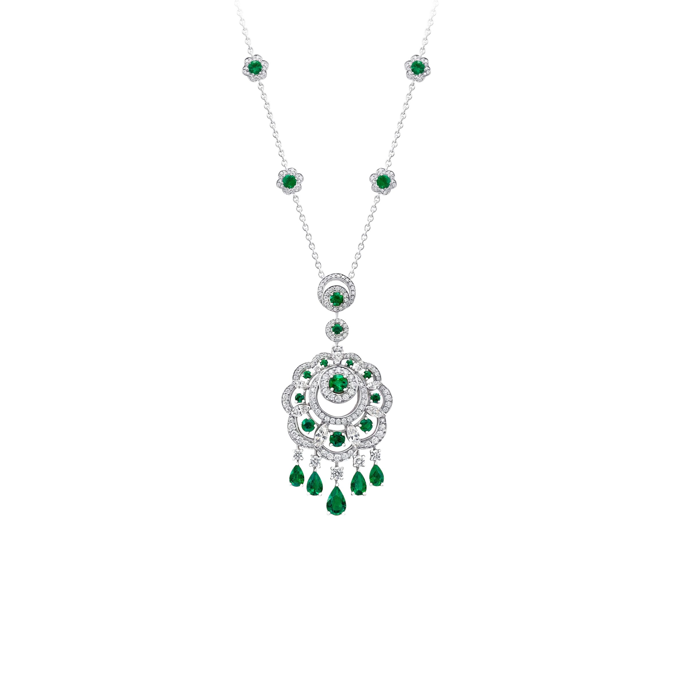 Anhänger aus 18K Weißgold 216 Diamanten (rund) - 1,92 ct F VS+ 9 Diamanten (fancy Form) - 0,86 ct F VS+ 17 Smaragde (rund) - 2,10 ct 5 Smaragde (Tropfenform) - 1,71 ct