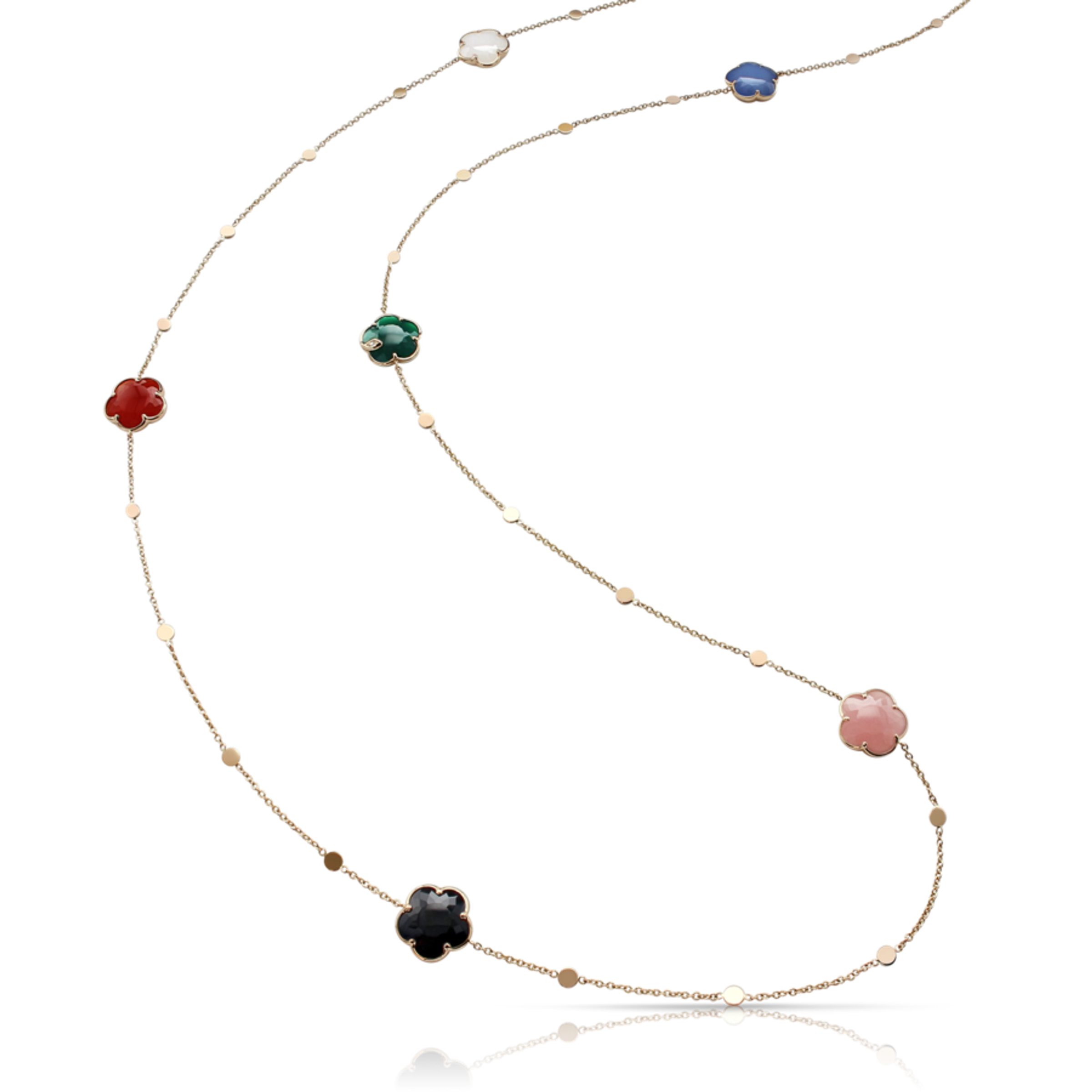 Halskette aus 18K Roségold, Länge 101,5 cm. Weißer und grüner Achat, rosa Chalcedon, Karneol, Dublett aus weißem Achat und Lapislazuli in Blumenform mit einem Durchmesser von 12 mm. Gesamtgewicht der Diamanten: 0,02 ct.