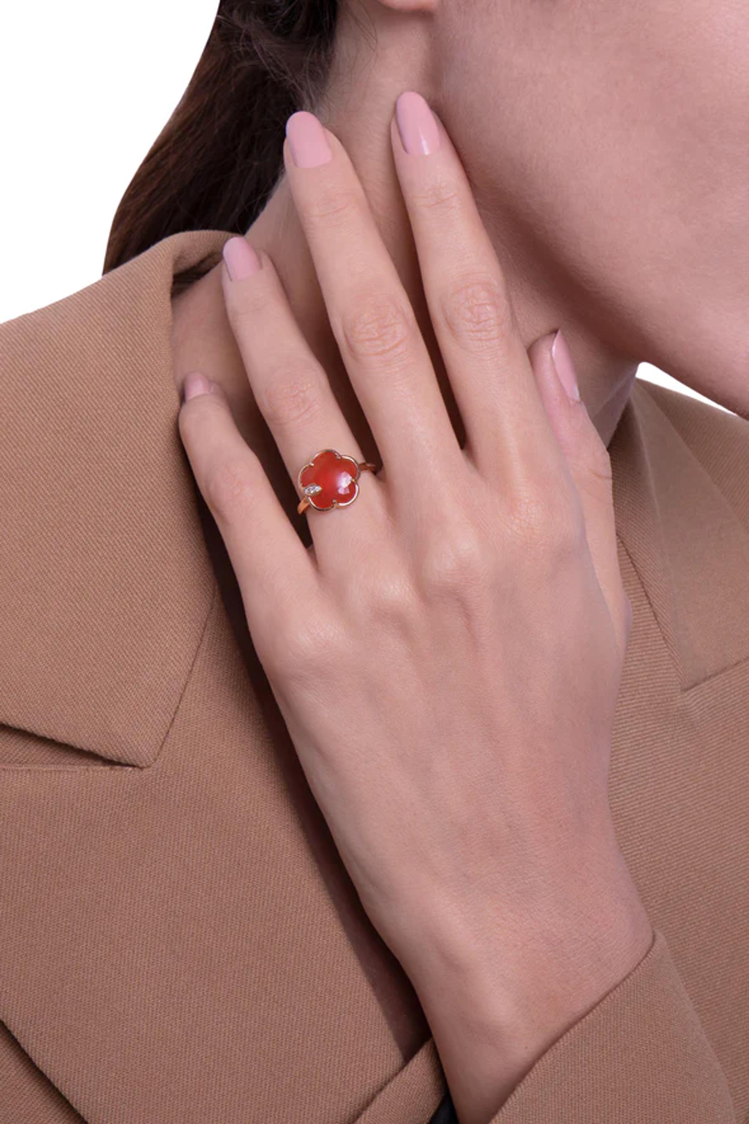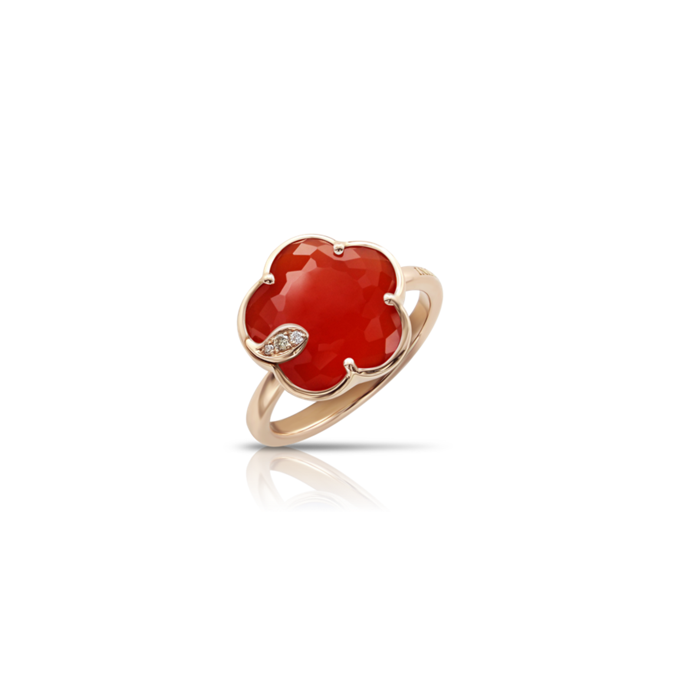 Ring aus 18k Roségold. Karneol in Blumenform mit einem Durchmesser von 12 mm. Diamanten: weiß – 0,01 ct, champagne – 0,03 ct.
