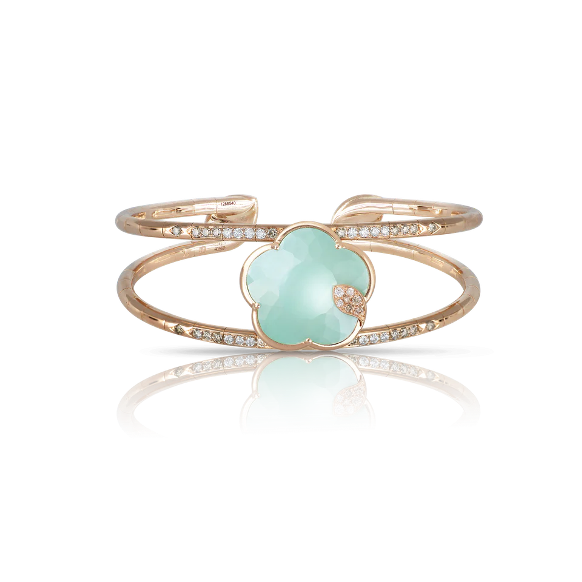 Armband aus 18-karätigem Roségold. Dublett aus Türkis und weißem Mondstein in Blumenform mit einem Durchmesser von 19 mm. Diamanten: weiß – 0,30 ct, champagne – 0,44 ct.