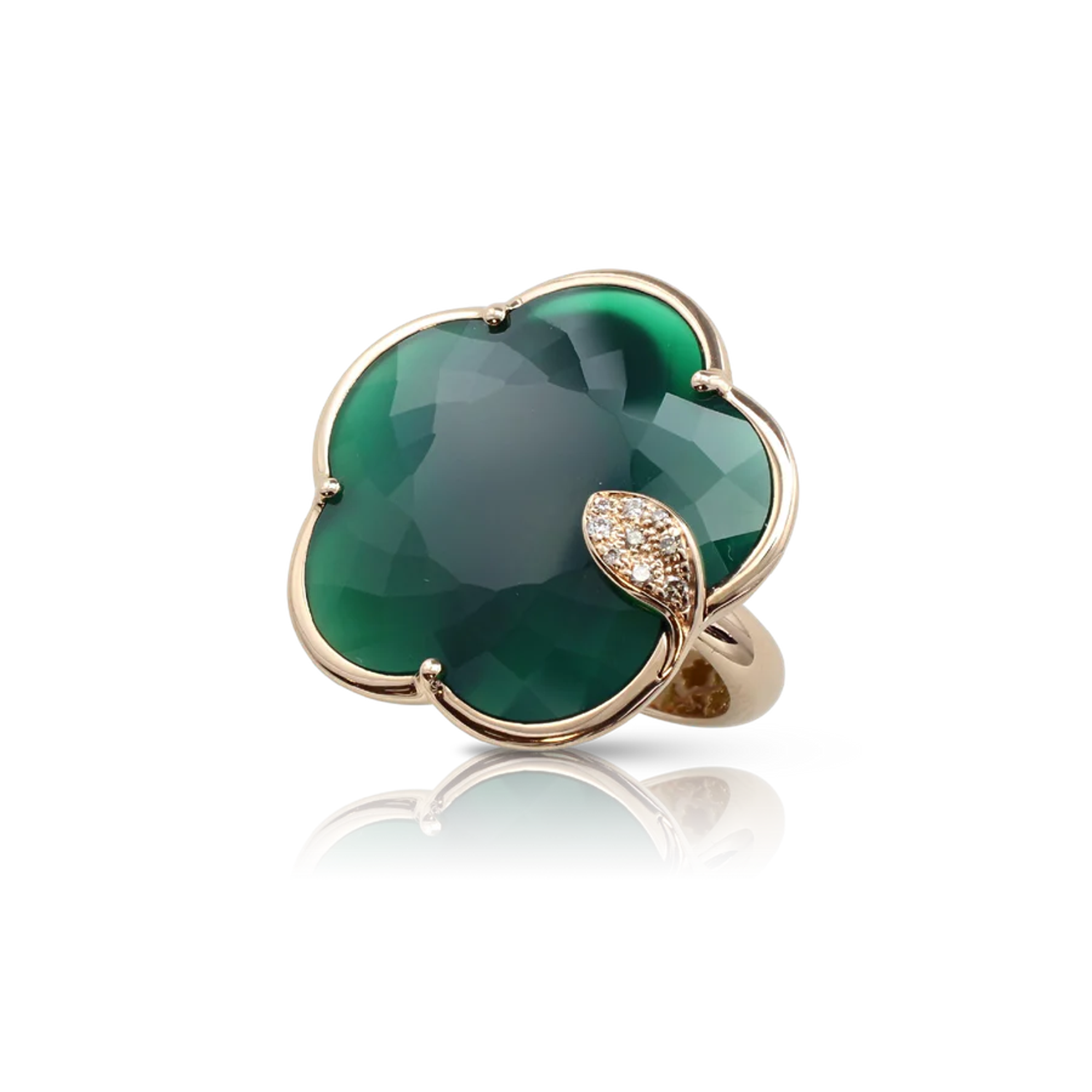 Ring aus 18K Roségold. Grüner Achat in Blumenform mit einem Durchmesser von 24 mm. Diamanten: weiß - 0,03 ct, champagne - 0,06 ct.