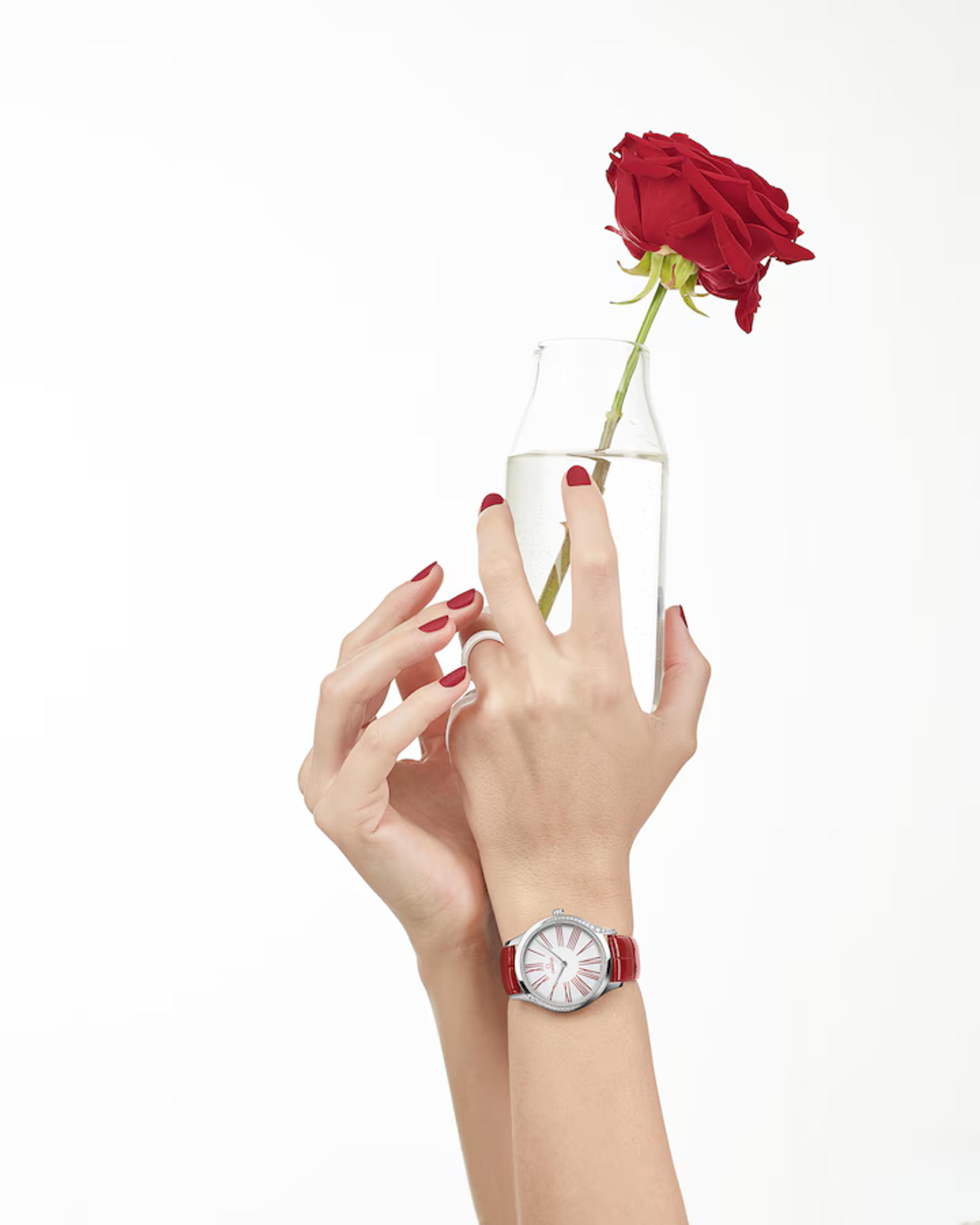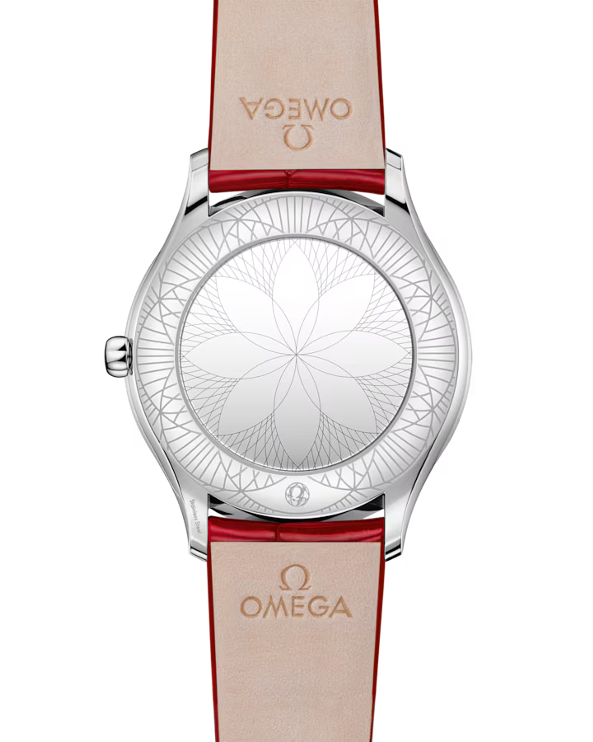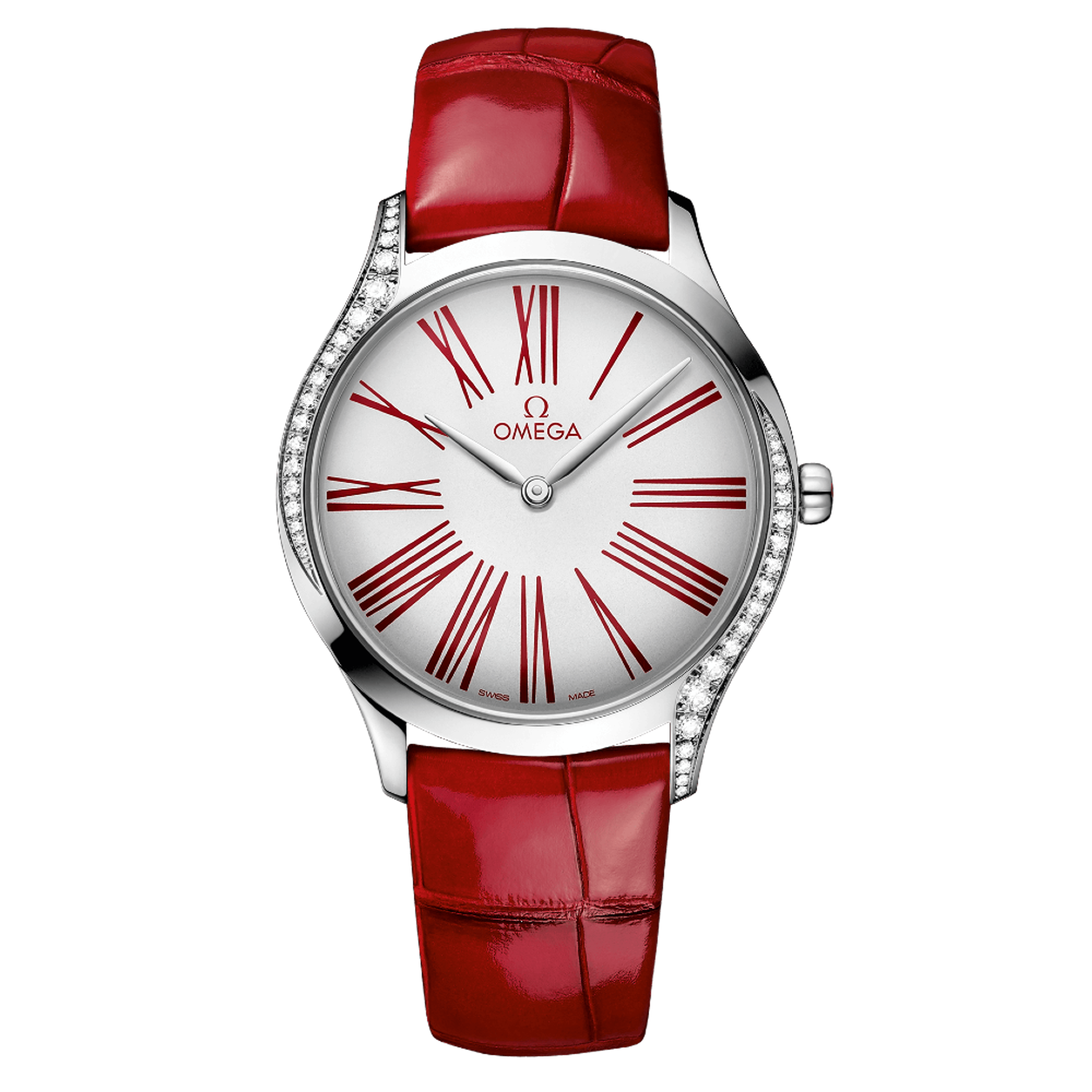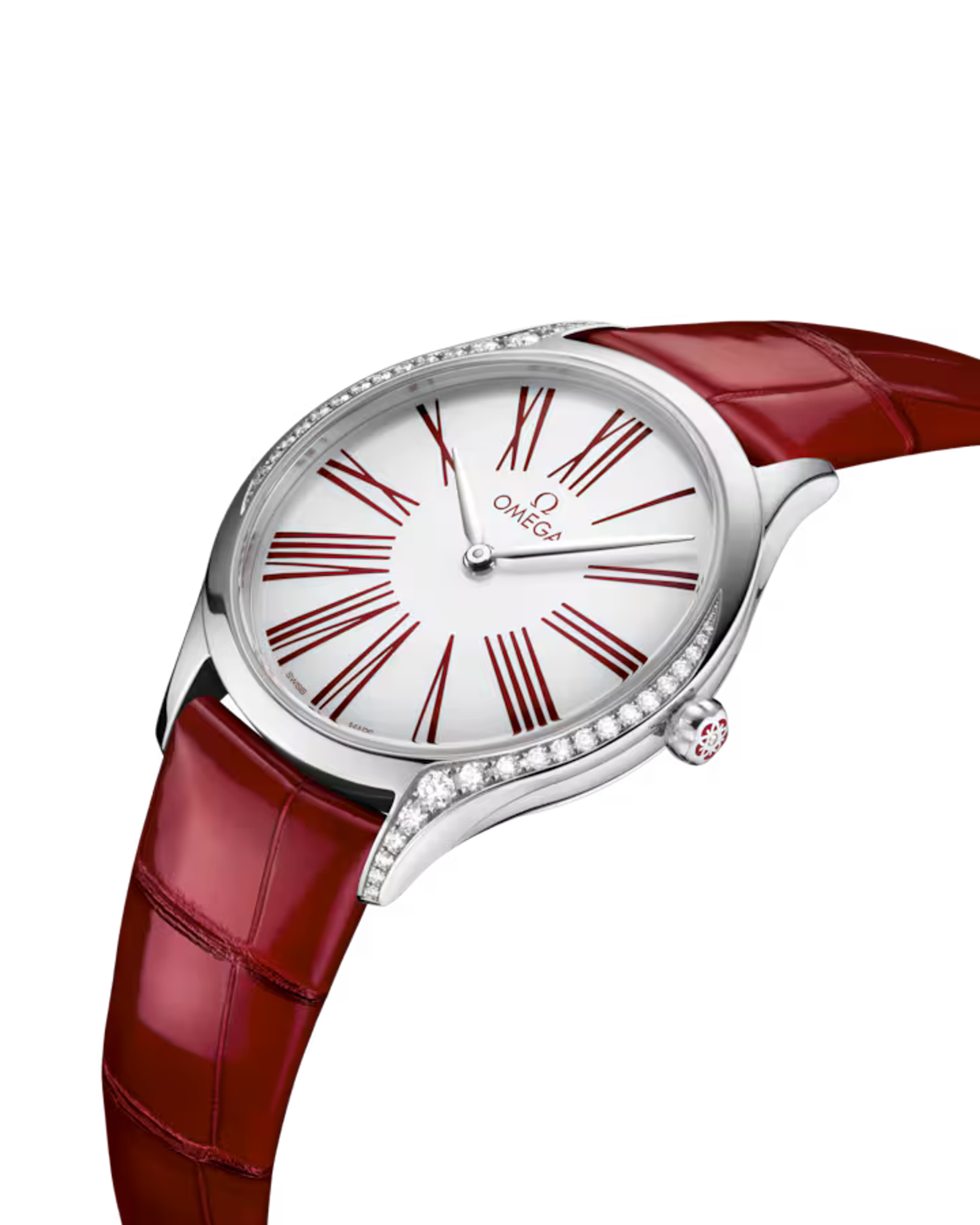 Damenquarzuhren Omega, Gehäuse - Edelstahl, 36 mm. Armband - Alligator. Diamanten.