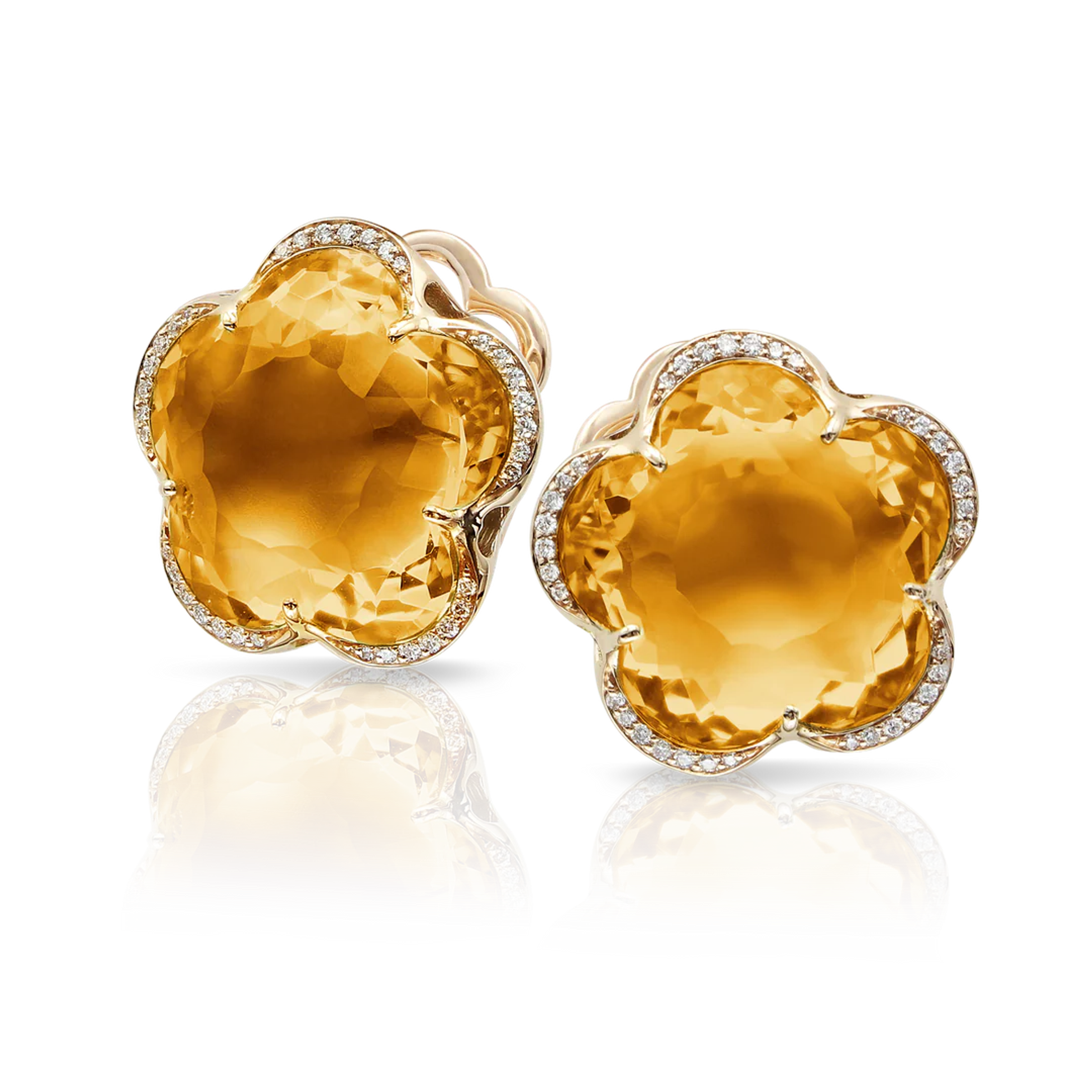 Earrings made of 18K rose gold. Citrine in the shape of a flower measuring 14 mm. Total diamond weight - 0.18 ct.