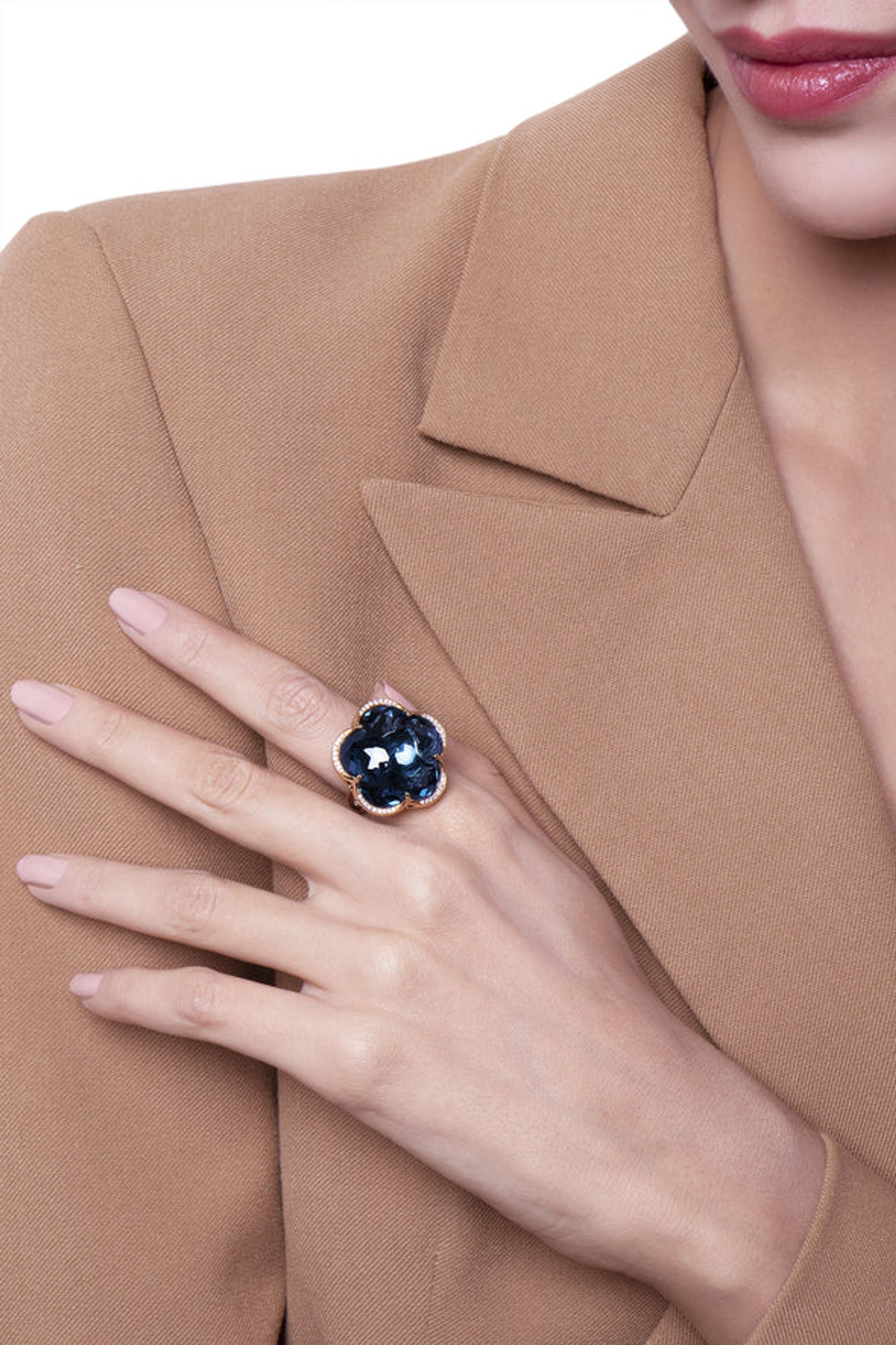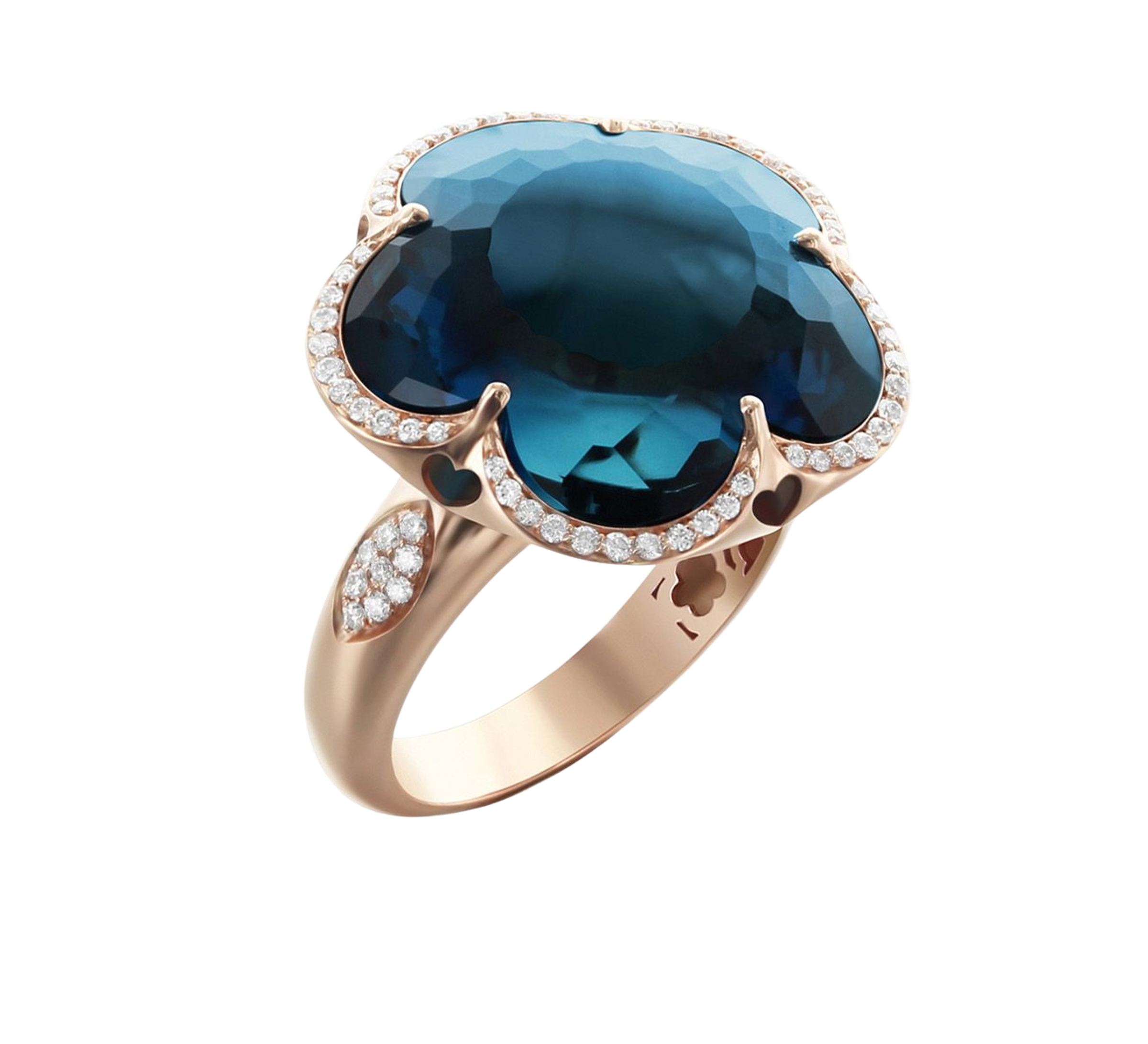 Ring made of 18K rose gold. London blue topaz in the shape of a flower, measuring 22 mm. Total diamond weight - 0.28 ct.
