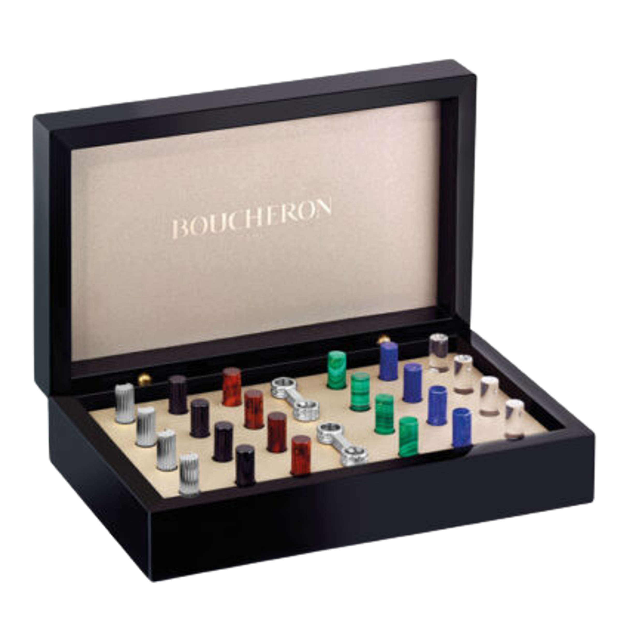 A set of cufflinks. The base of the cufflink is made of 18K white gold, while the interchangeable components are crafted from lapis lazuli, malachite, onyx, quartz, and rare hardwood.