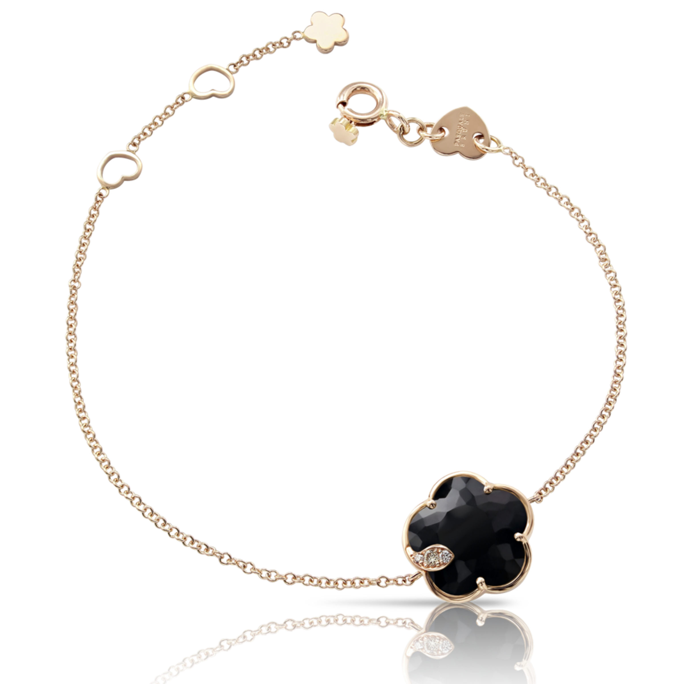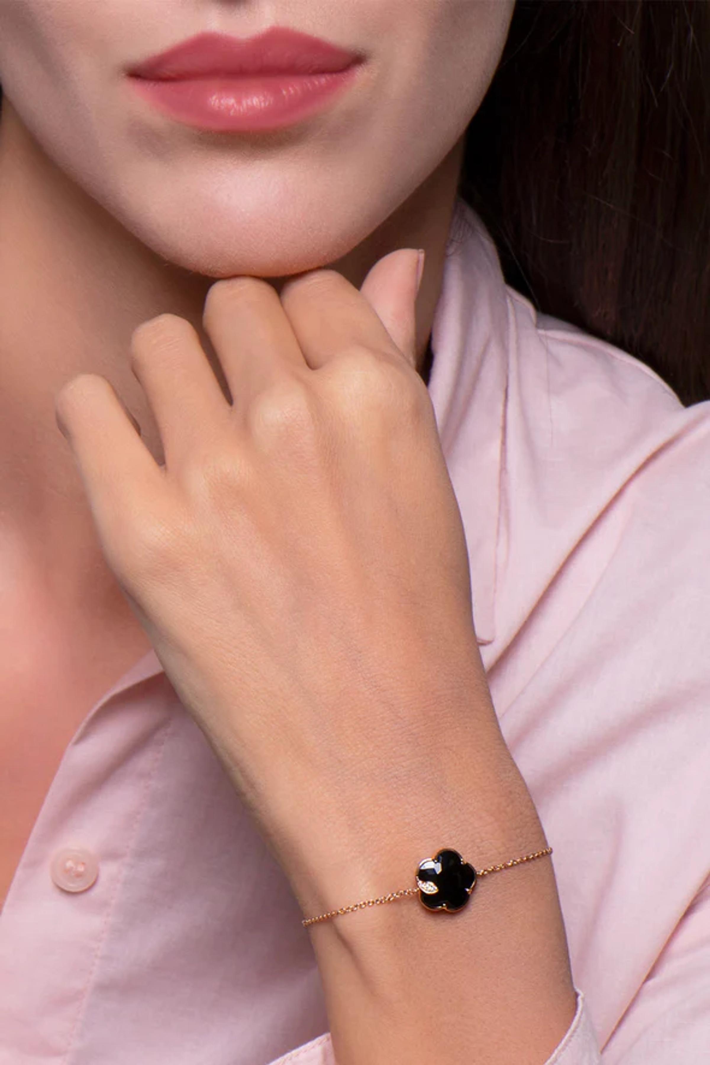 Bracelet made of 18K rose gold. Length 18.5 cm. Black onyx in the shape of a flower measuring 12 mm. Diamonds: white - 0.01 ct, champagne - 0.03 ct.