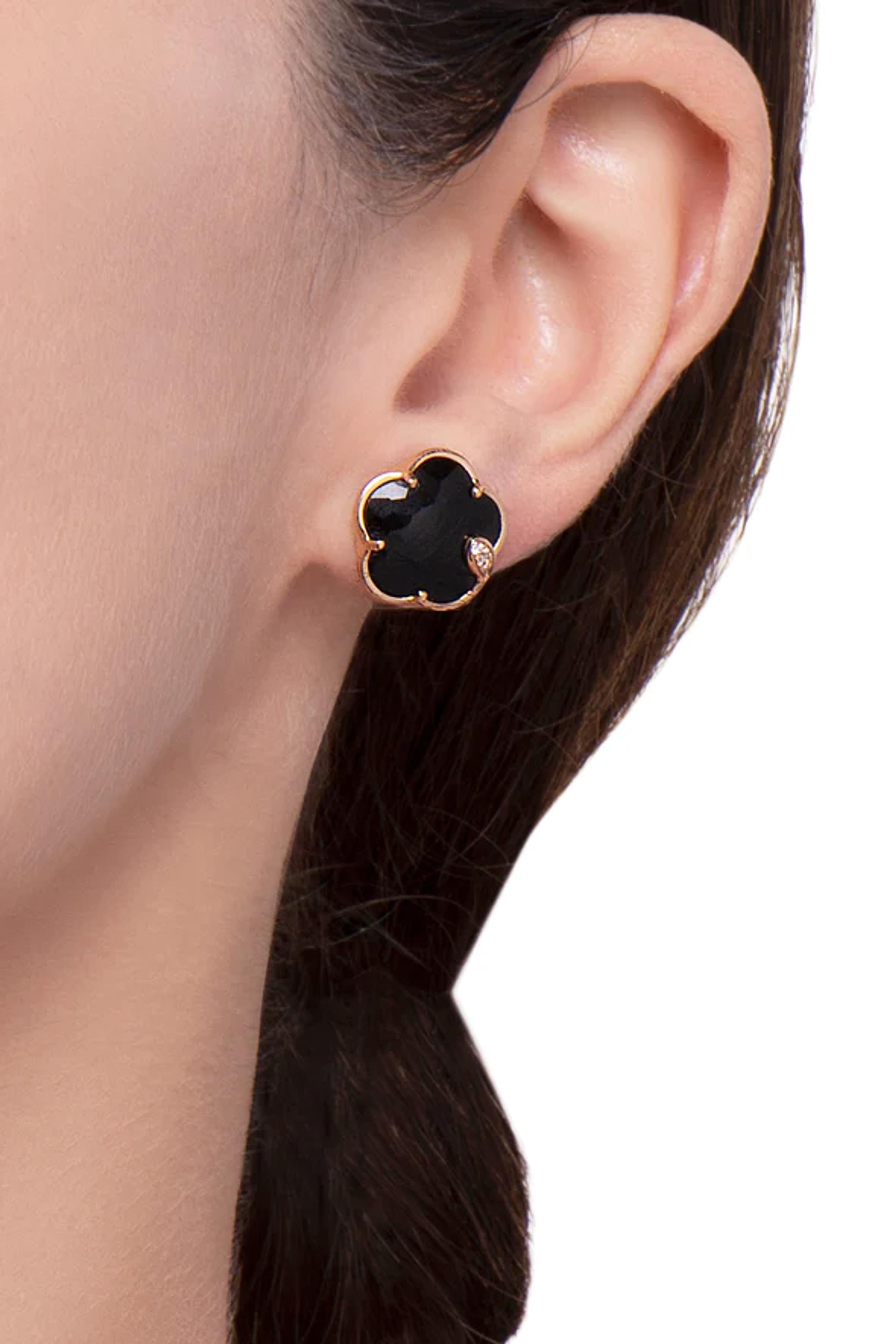 Earrings made of 18K rose gold. Onyx in the shape of a flower, measuring 12 mm. Diamonds: white – 0.02 ct, champagne – 0.04 ct.