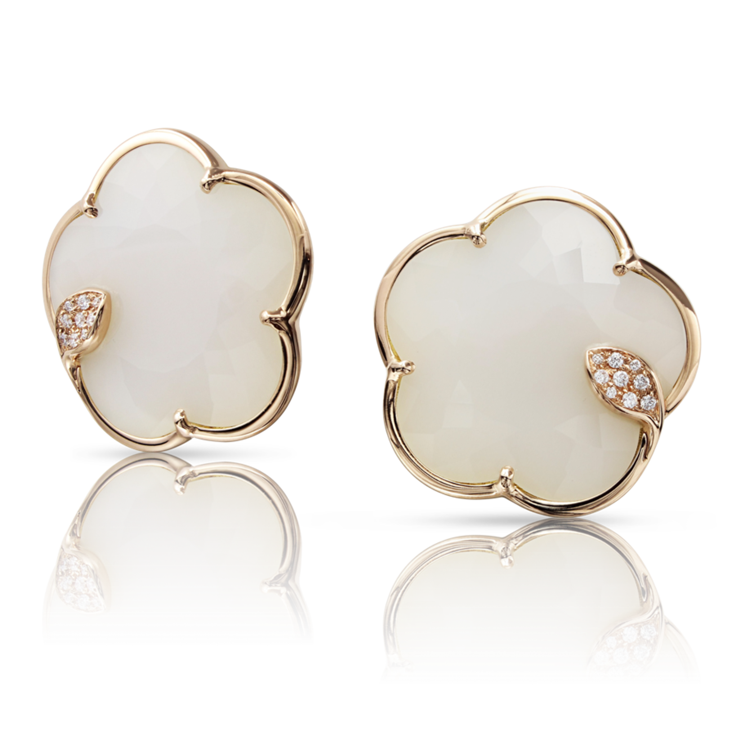 Earrings crafted from 18k rose gold. A doublet of white agate and mother-of-pearl in the shape of a flower, measuring 24 mm. Total diamond weight - 0.21 ct (white, champagne).