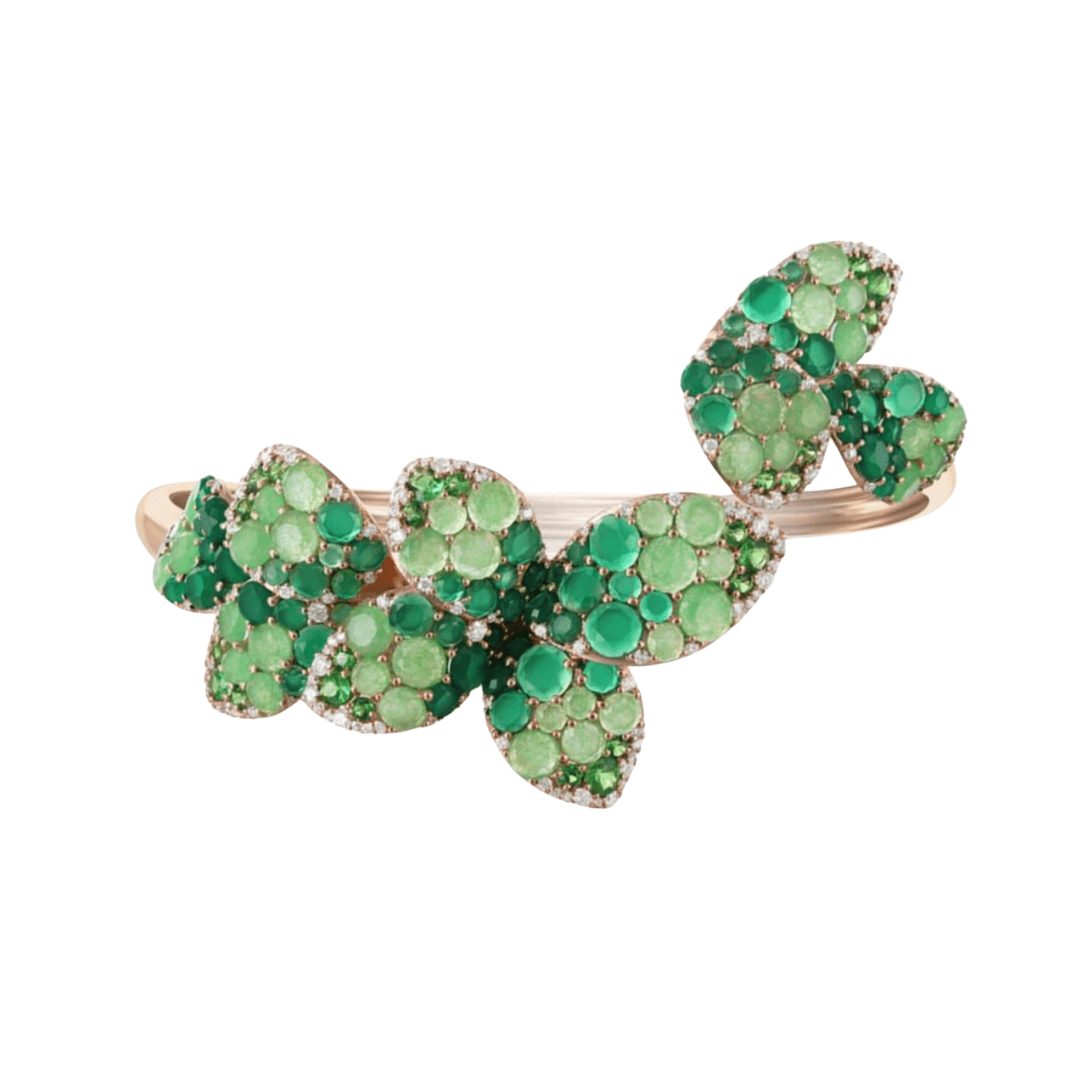 Bracelet made of 18K rose gold, nephrite, green agates, tsavorites, and diamonds.