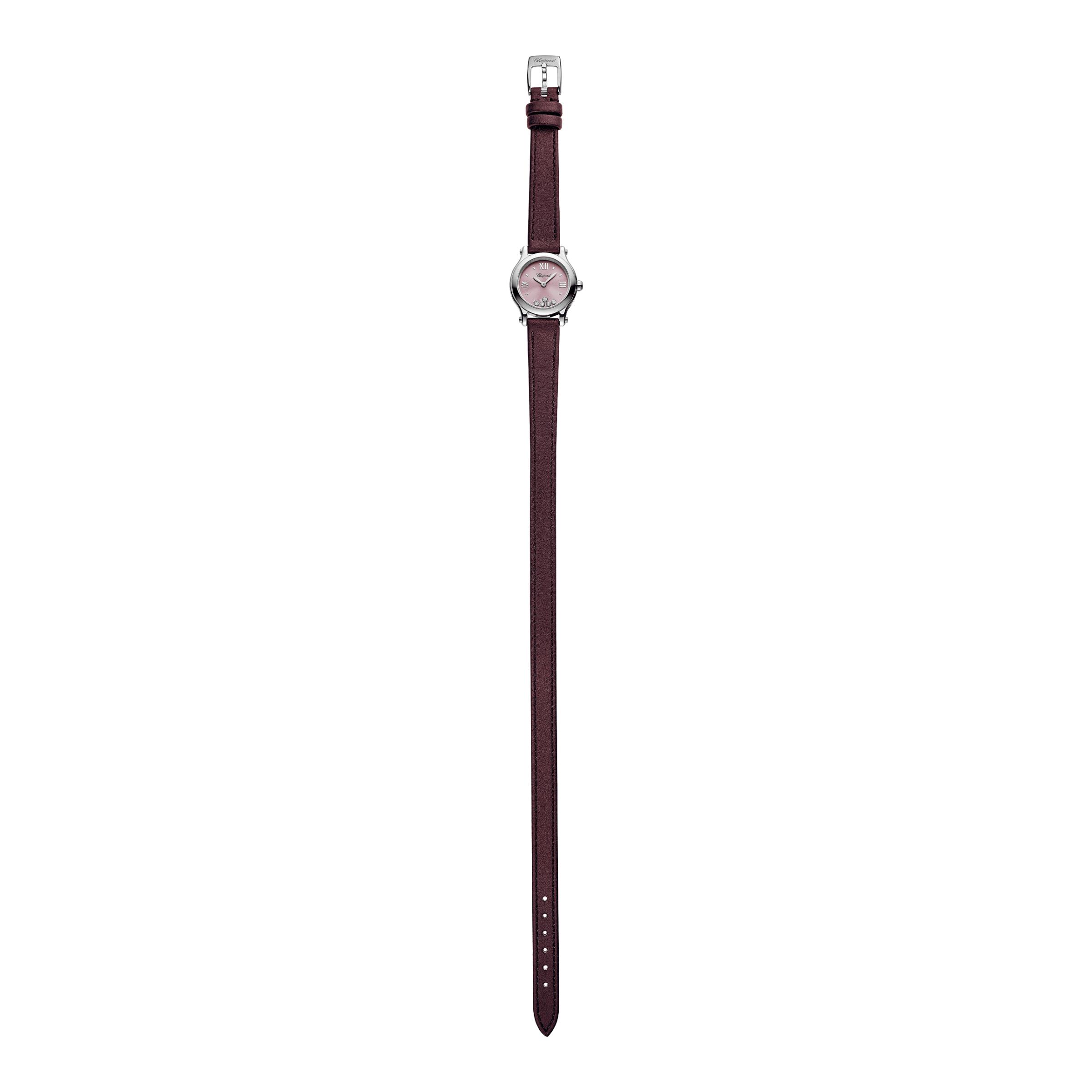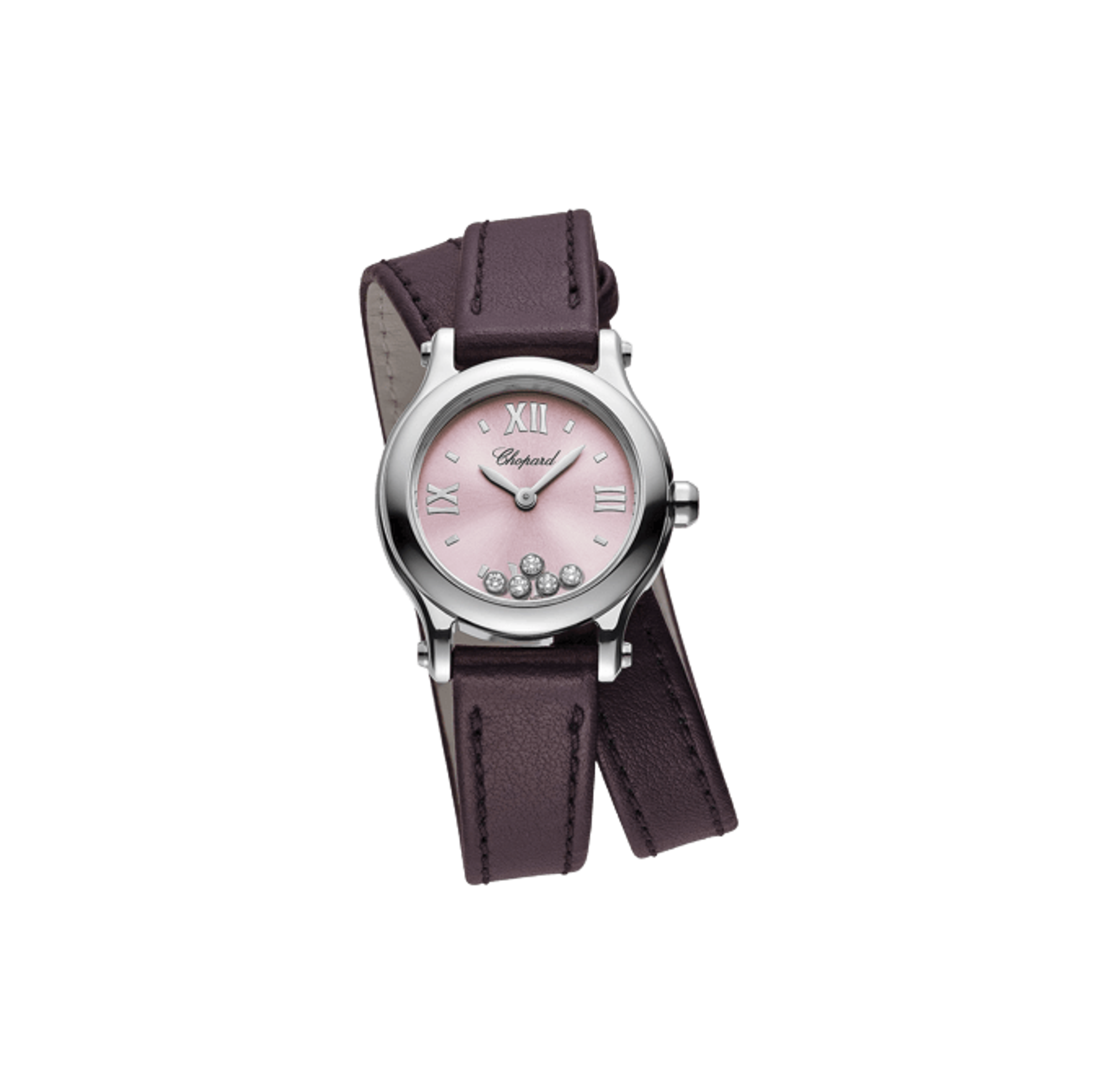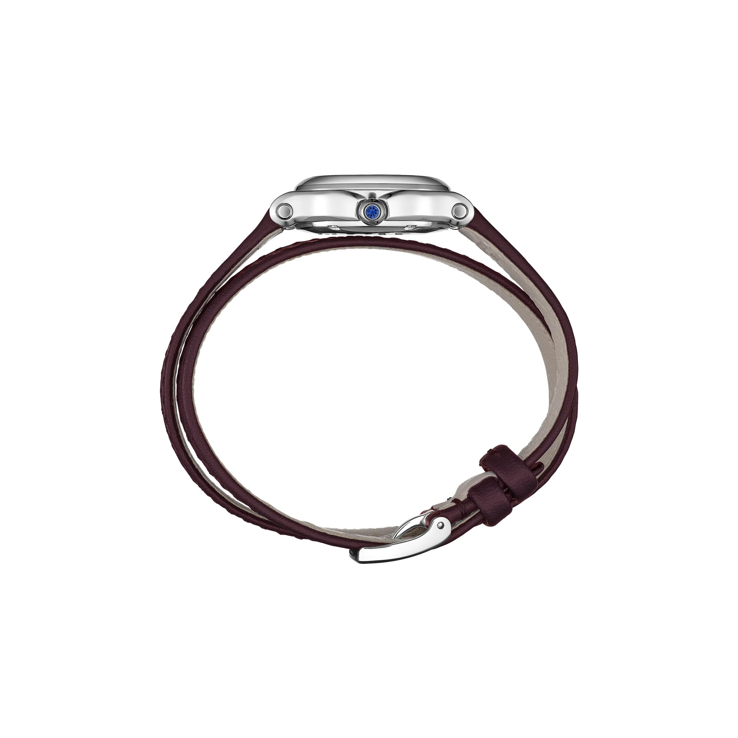 Ladies' quartz watch, case - steel, 25 mm. Strap - purple calfskin. Total weight of diamonds (5 pieces) - 0.09 ct. 1 sapphire - 0.09 ct (crown).