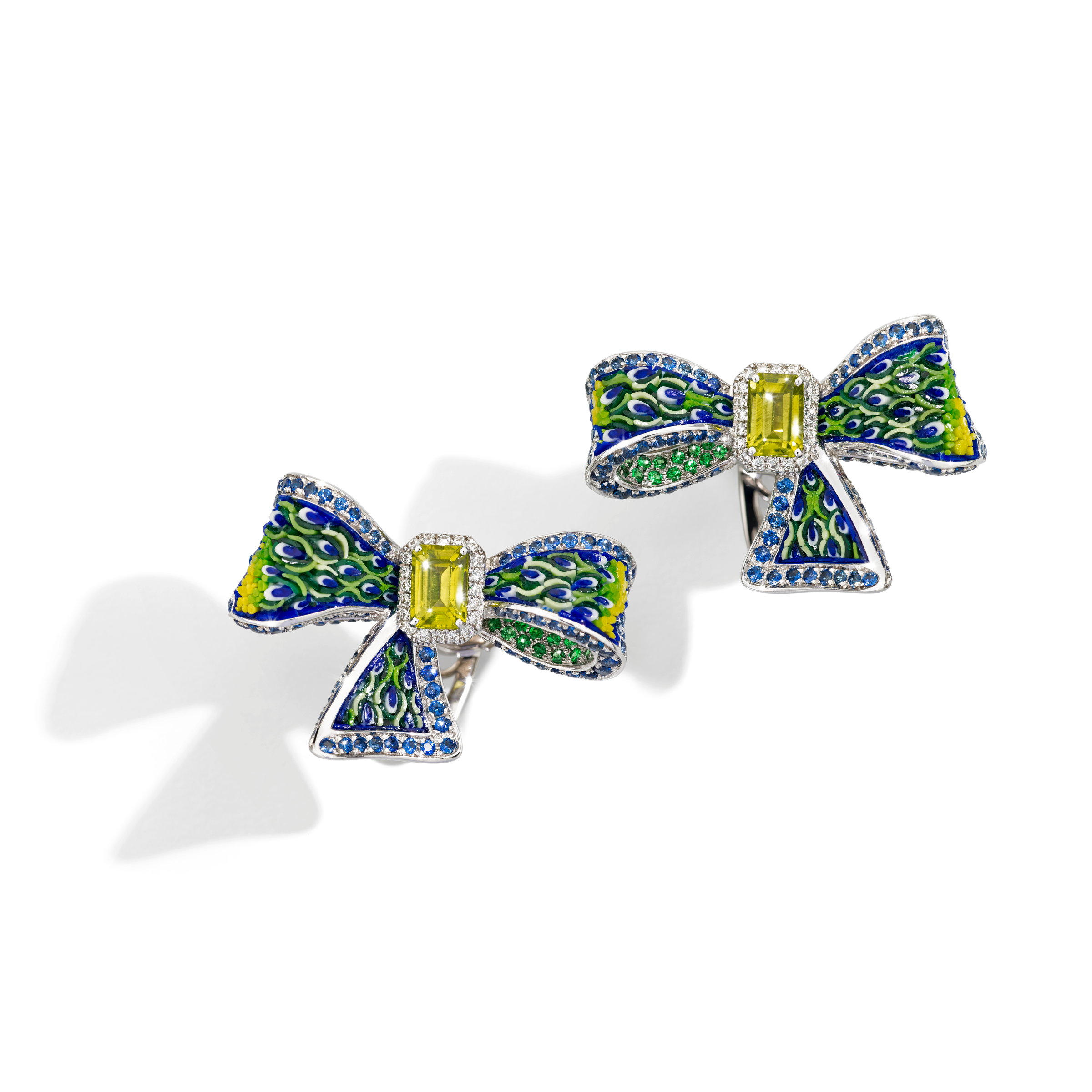 Women's earrings made of 18K white gold. Total weight: diamonds - 0.17 ct, blue sapphires - 1.34 ct, tsavorites - 0.16 ct, peridots - 1.33 ct.