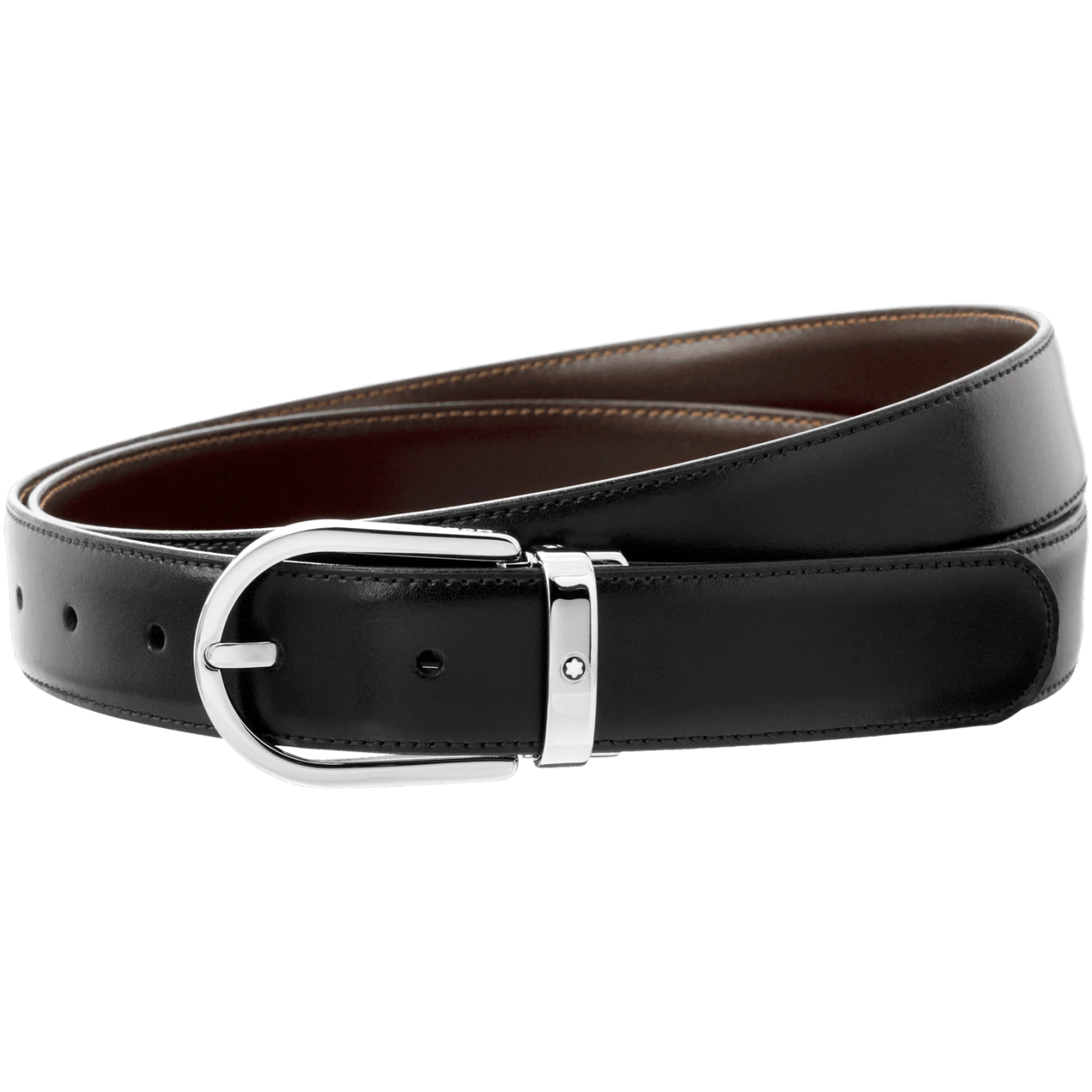 The Montblanc belt from the Classic Line is crafted from fine calfskin. It features a reversible design in black and dark brown leather. The buckle is made of noble hypoallergenic stainless steel 316L.