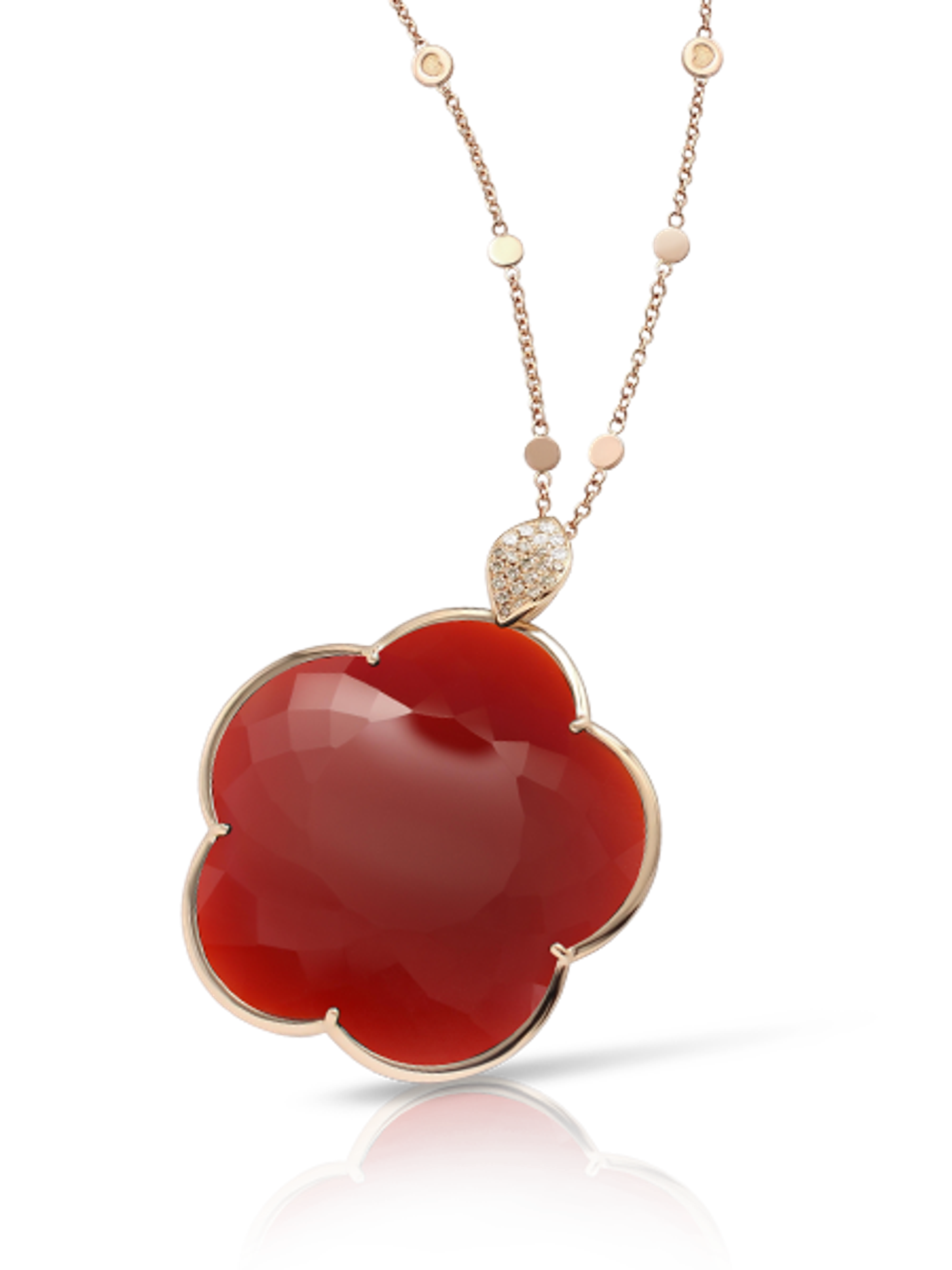 Pendant made of 18k rose gold. Agate in the shape of a flower, measuring 30 mm. Diamonds: white, champagne.