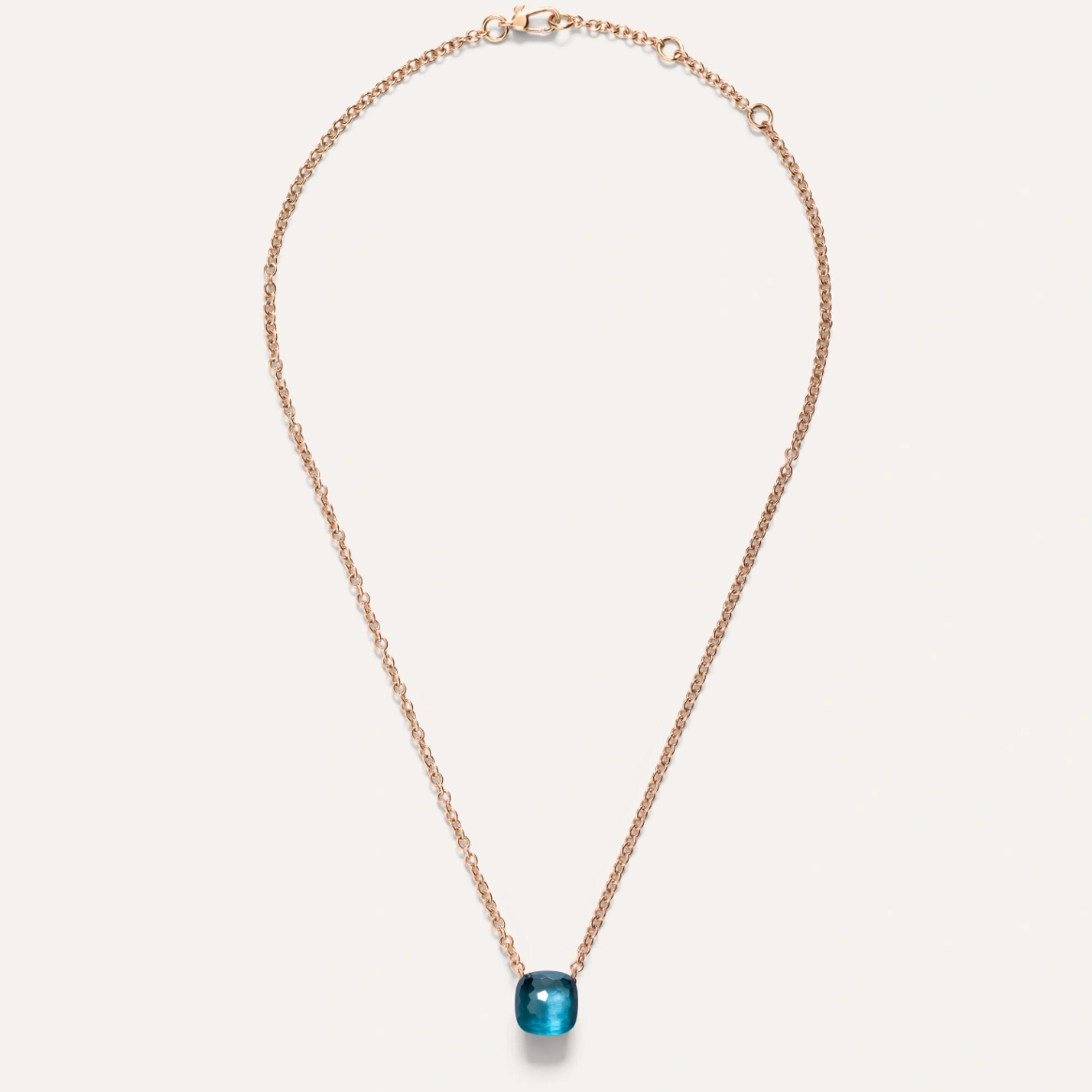 Necklace made of 18K rose and white gold. Adjustable chain length: 38–40–42 cm. London blue topaz weighing 6 ct.