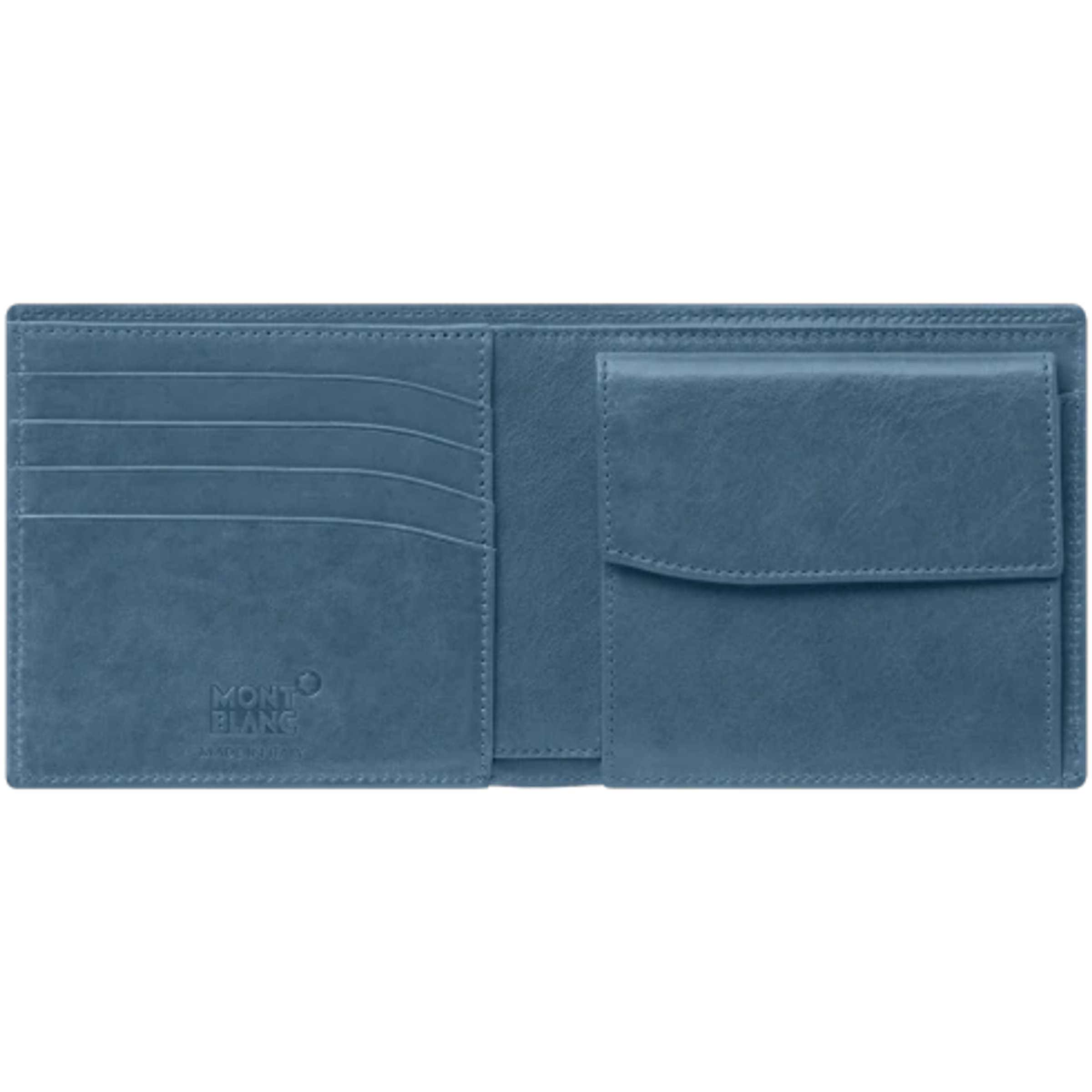 Wallet made of fine calfskin in black, complemented by a blue leather interior. Internal arrangement: four credit card slots, two banknote compartments, a coin pocket, and two additional pockets.