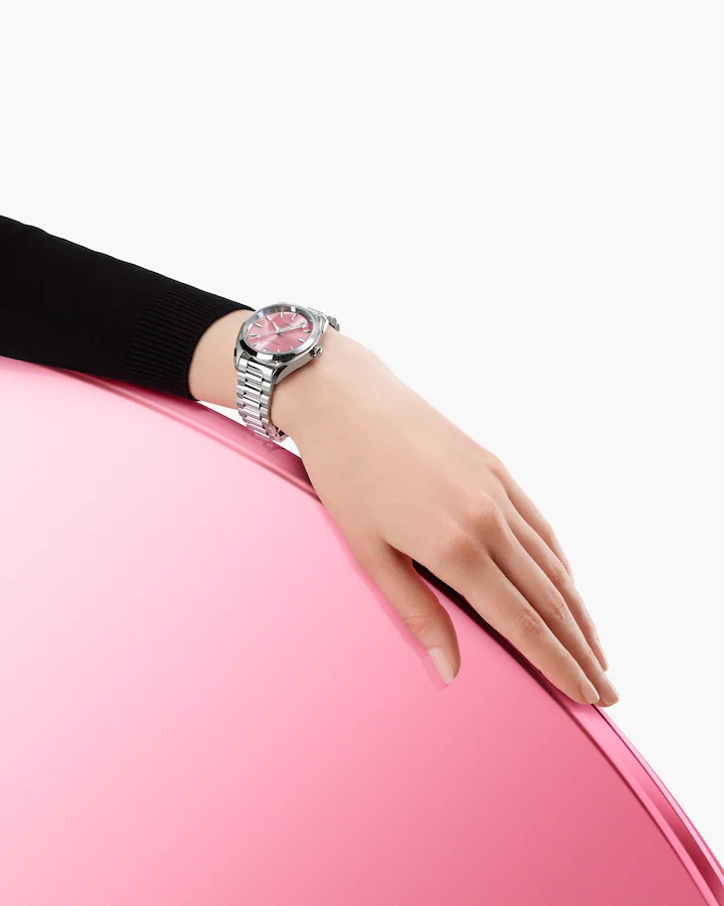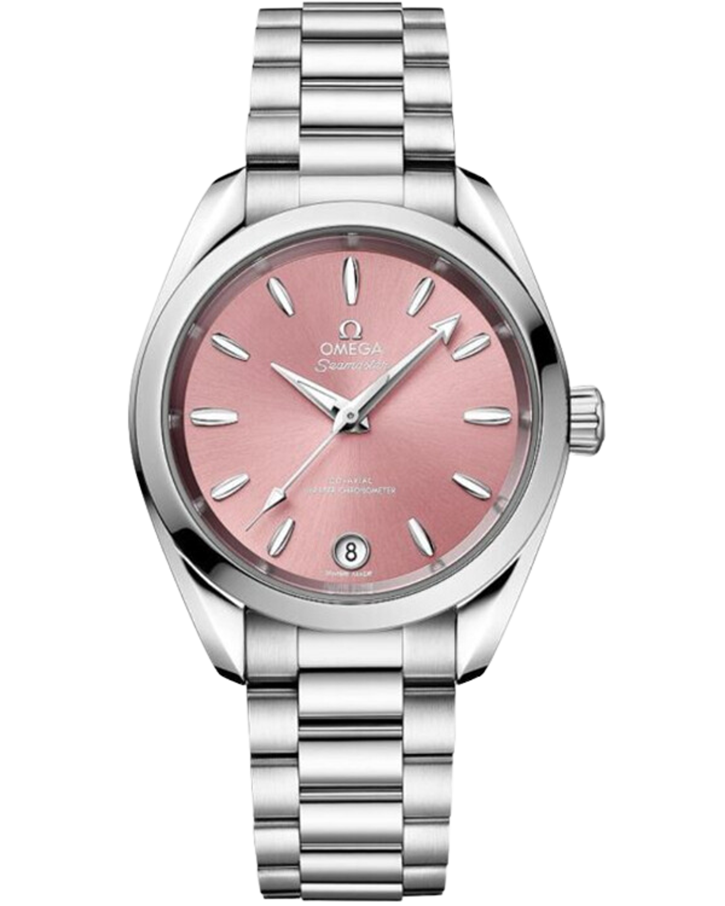 Ladies' automatic watch by Omega. Case - hypoallergenic stainless steel, 34 mm. Bracelet - hypoallergenic stainless steel. Date window, hands, indexes, and Omega logo are made of 18-carat white gold.