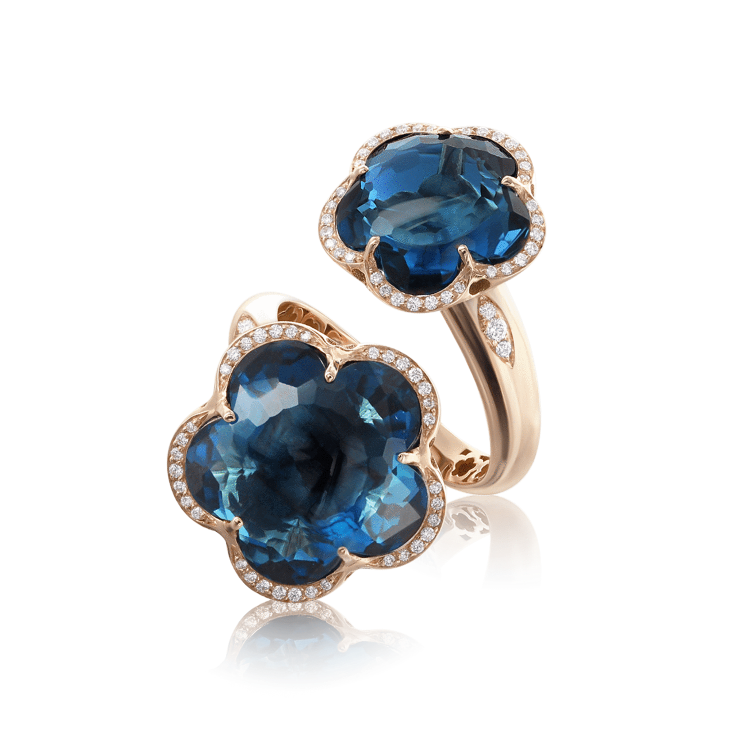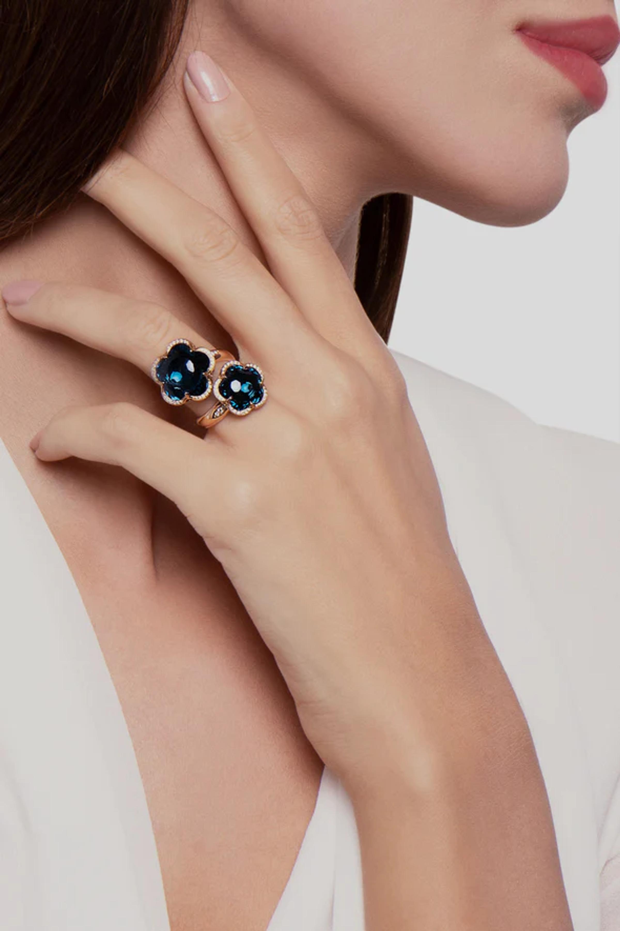 Кольцо из розового золота 18K. Лондонский голубой топаз в форме цветка размером 11 и 14 мм. Общий вес бриллиантов составляет 0,25 ct.