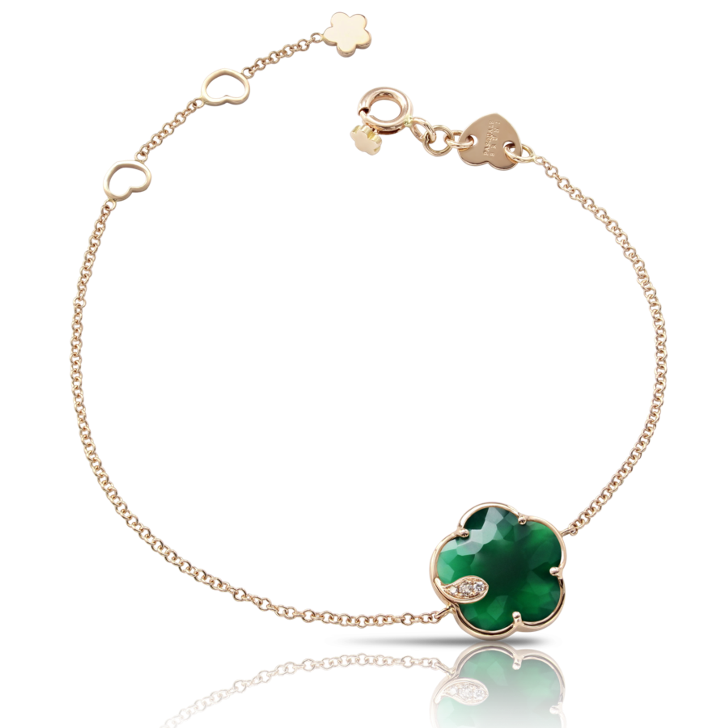 Браслет из розового золота 18K. Длина 18,5 см. Зеленый агат в форме цветка размером 12 мм. Алмазы: белые - 0,01 ct, шампань - 0,03 ct.