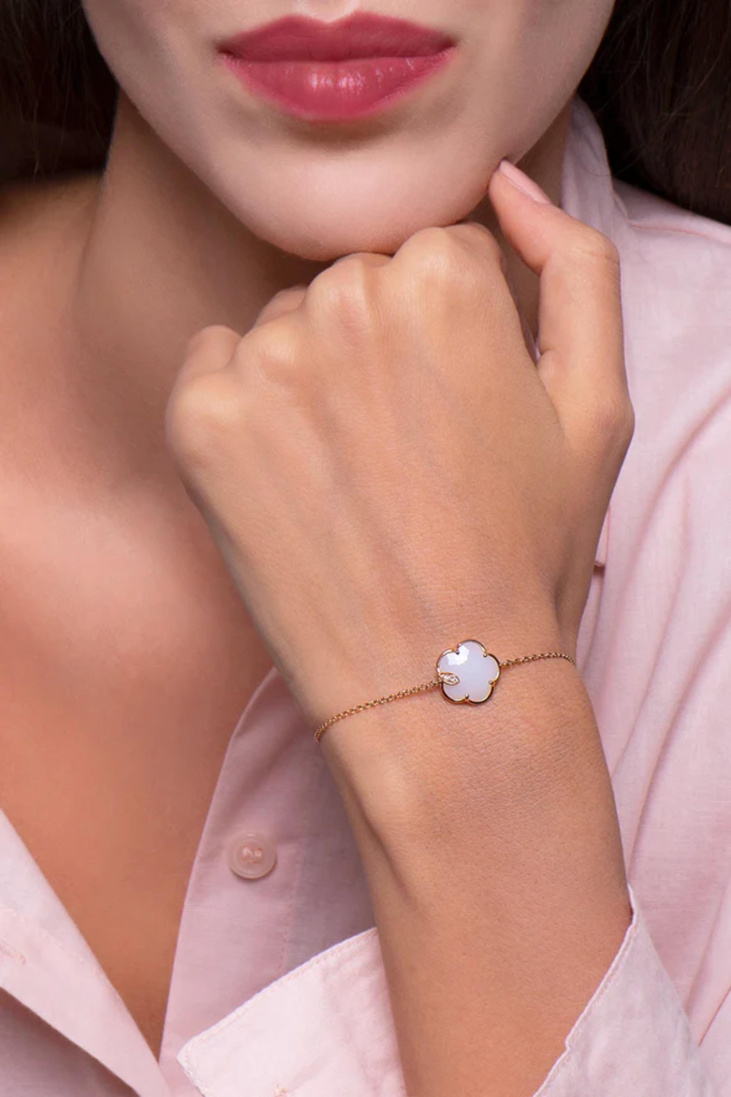 Браслет из розового золота 18K, длина 18,5 см. Белый агат в форме цветка размером 12 мм. Алмазы: белые 0,01 ct, шампань 0,03 ct.