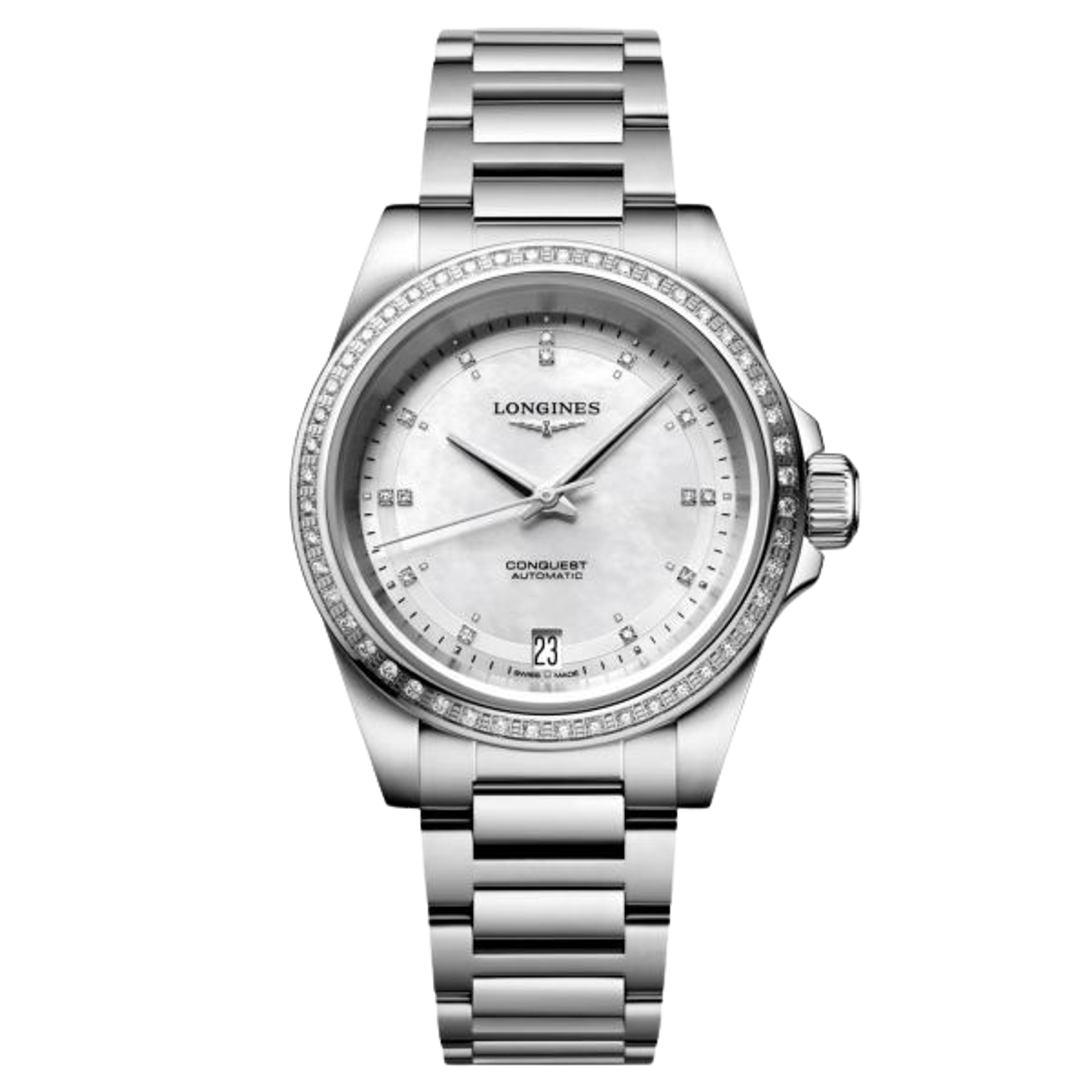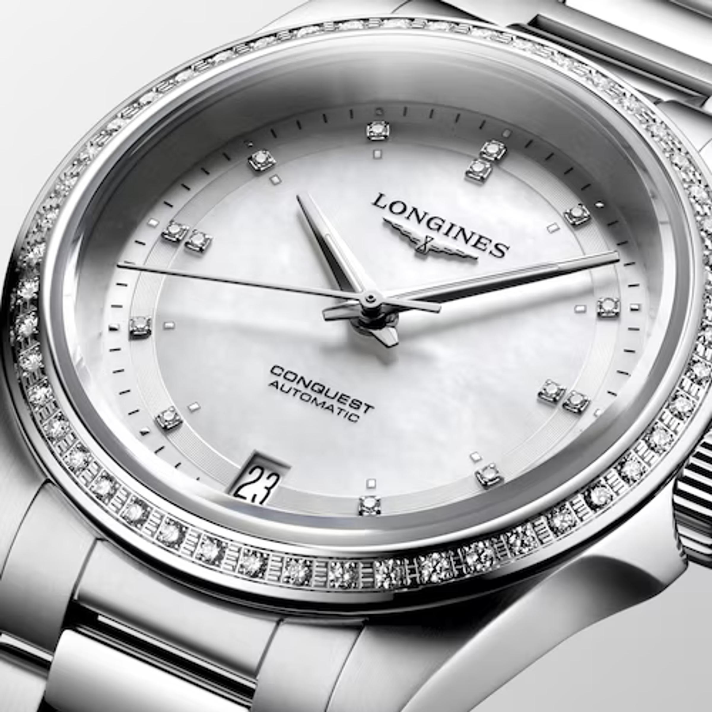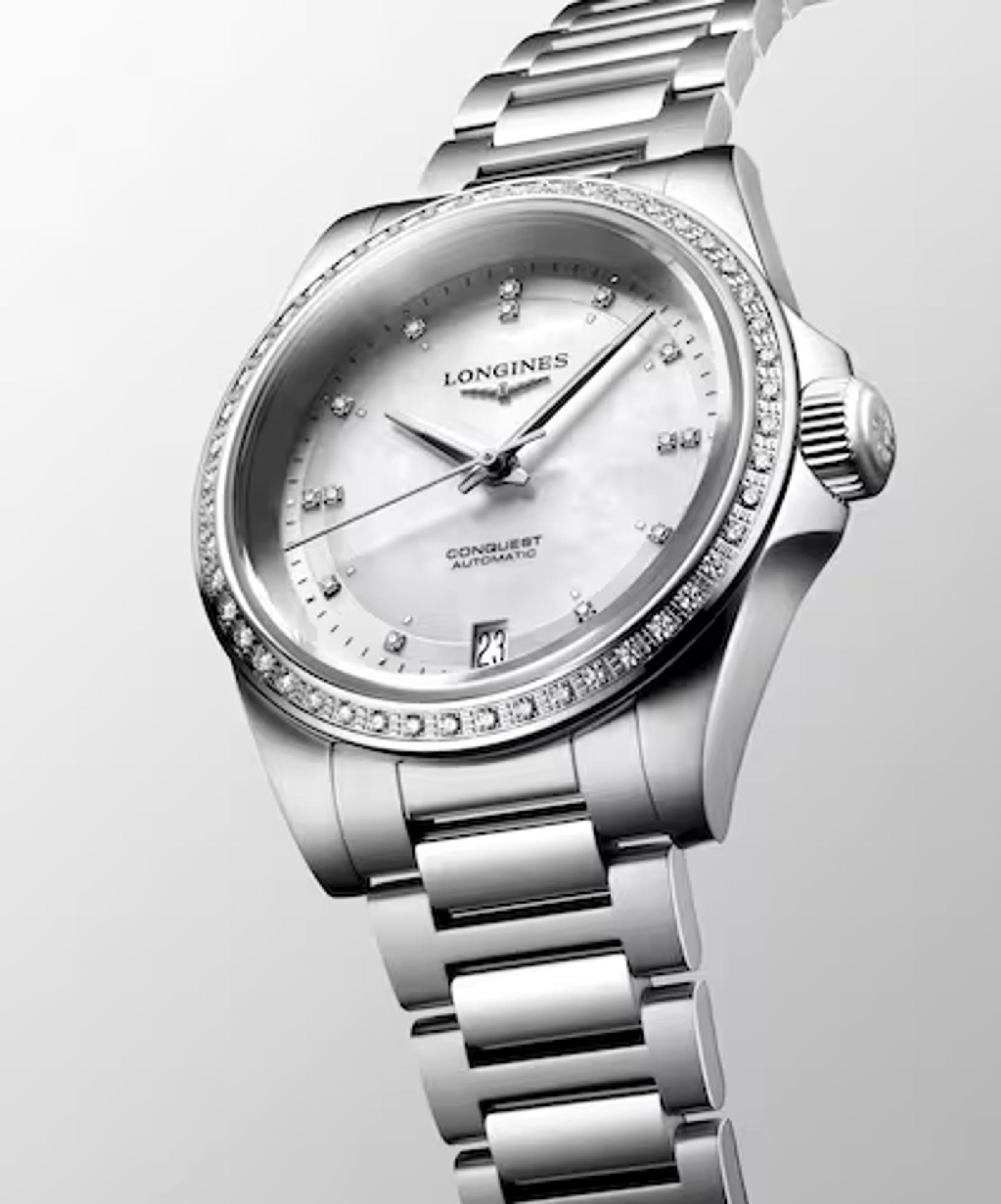 Женские автоматические часы, корпус – сталь, 34 мм. Браслет – сталь, циферблат – натуральный перламутр. Вес бриллиантов: безель – 0,403 ct IF-VVS, циферблат – 0,035 ct VS-SI.