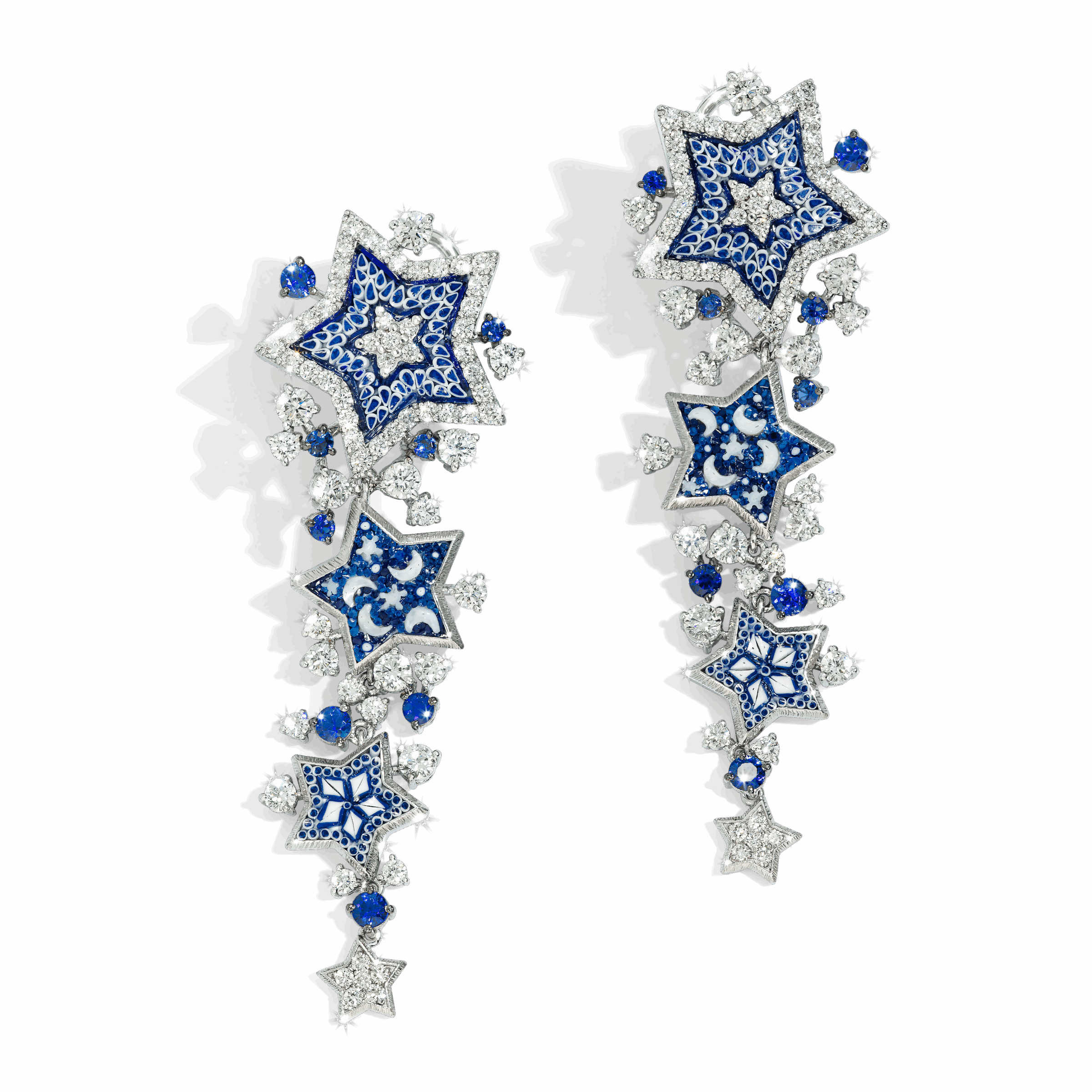 Серьги из белого золота 18K, с бриллиантами и сапфирами.