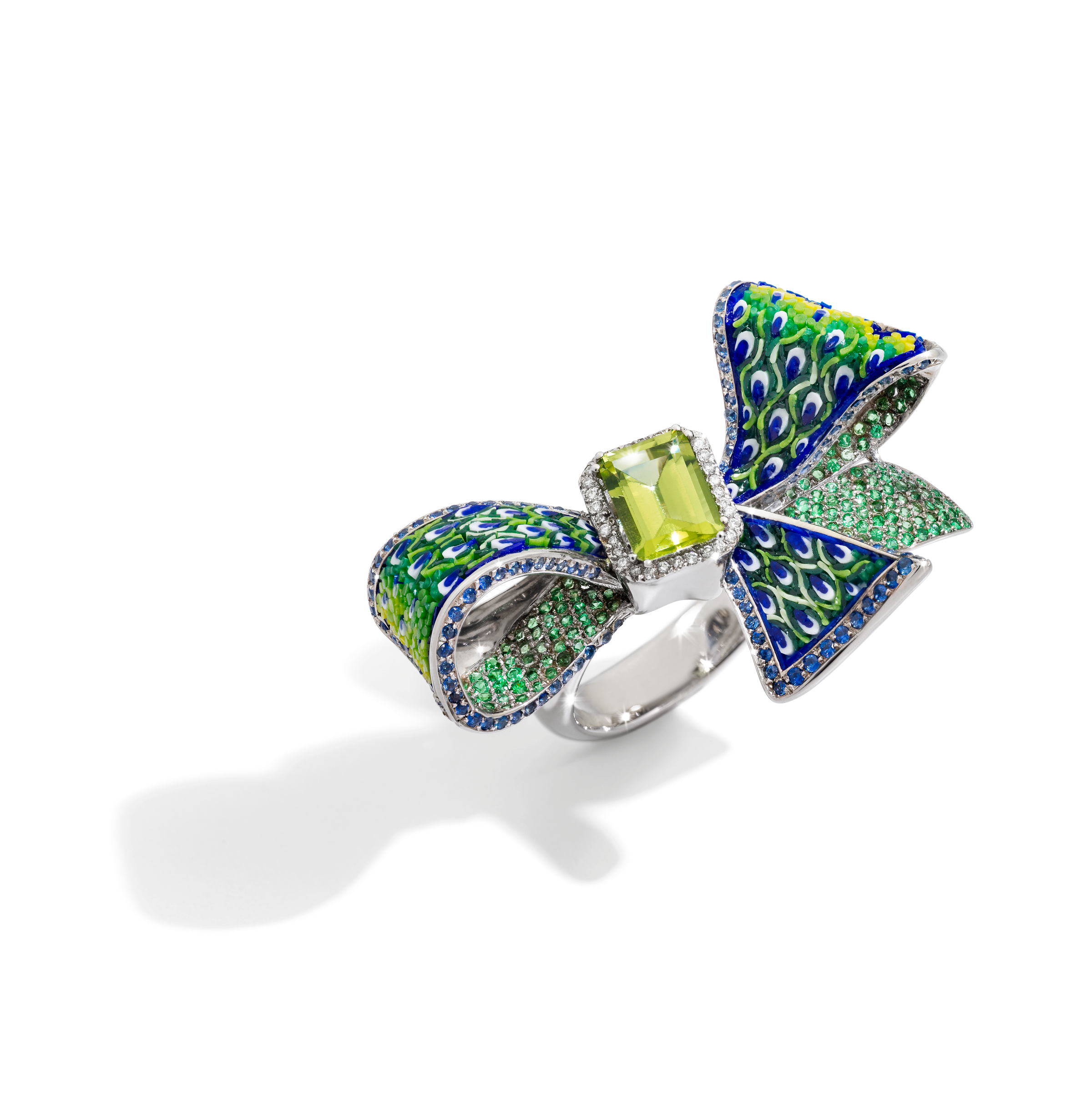 Женское кольцо из 18-каратного белого золота. Общая масса: бриллианты - 0,10 карата, голубые сапфиры - 1,23 карата, цавориты - 1,04 карата, перидоты - 1,56 карата.