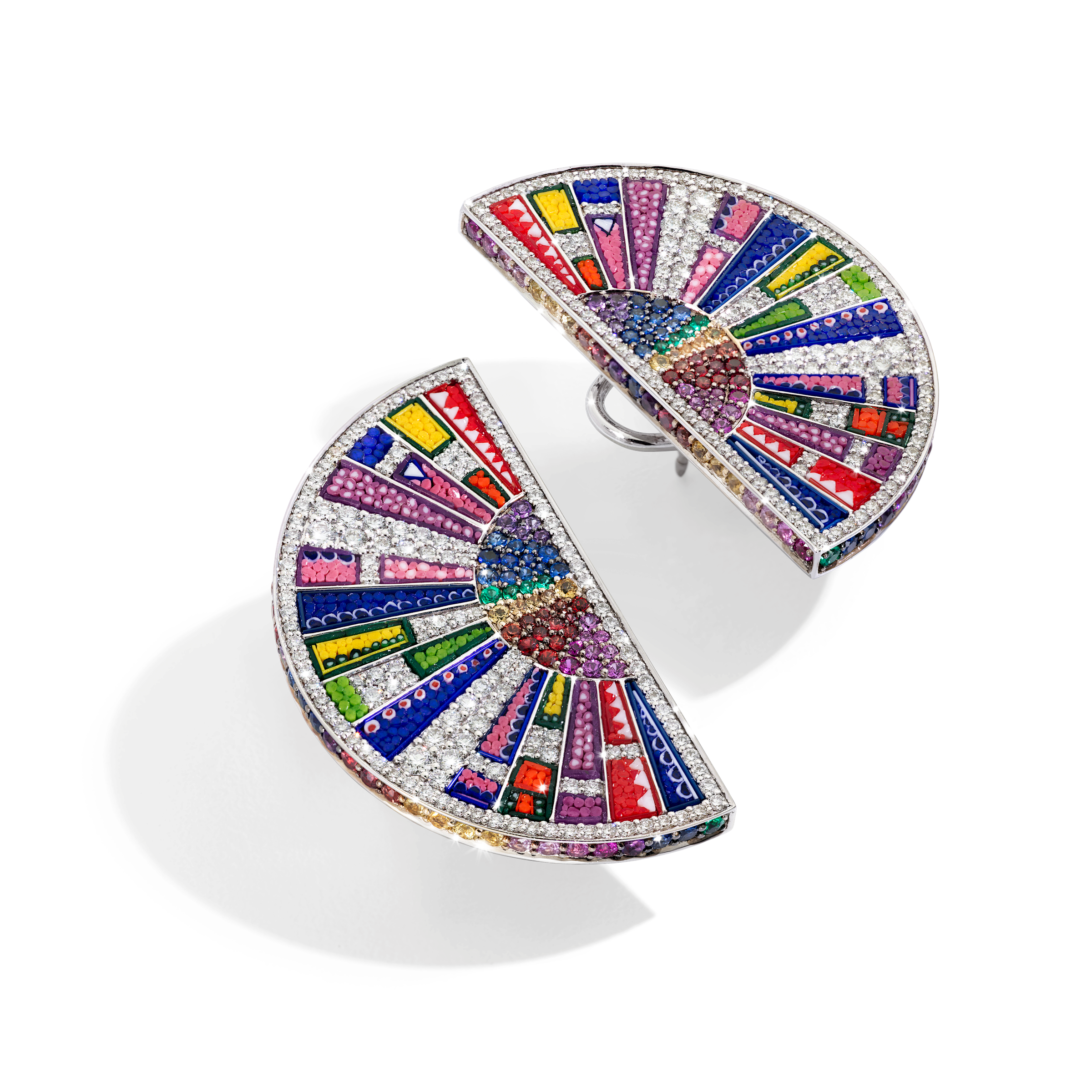 Женские серьги из 18-каратного белого золота. Бриллянты 1,84 карата Аметисты 0,23 карата Изумруды 0,14 карата Синие сапфиры 0,63 карата Желтые сапфиры 0,64 карата Розовые сапфиры 0,74 карата Фиолетовые сапфиры 0,04 карата Оранжевые сапфиры 0,68 карата
