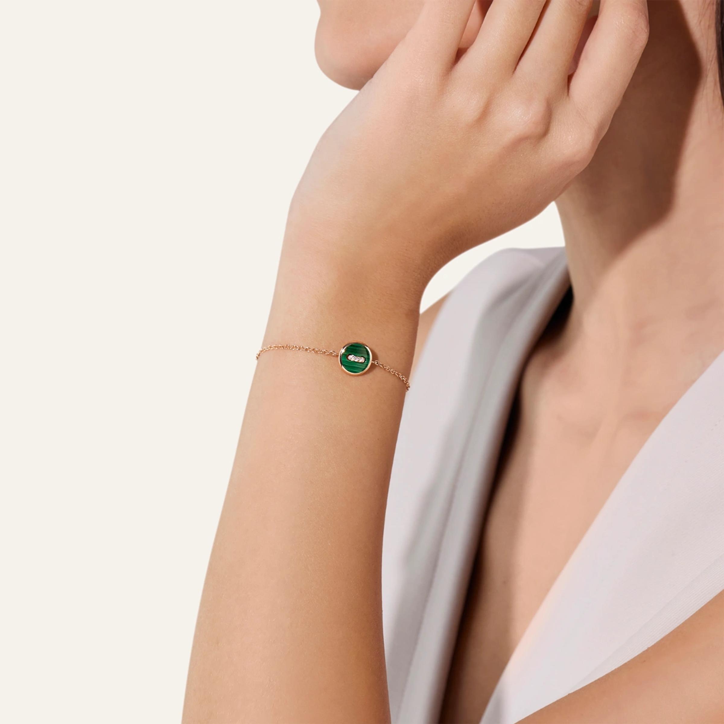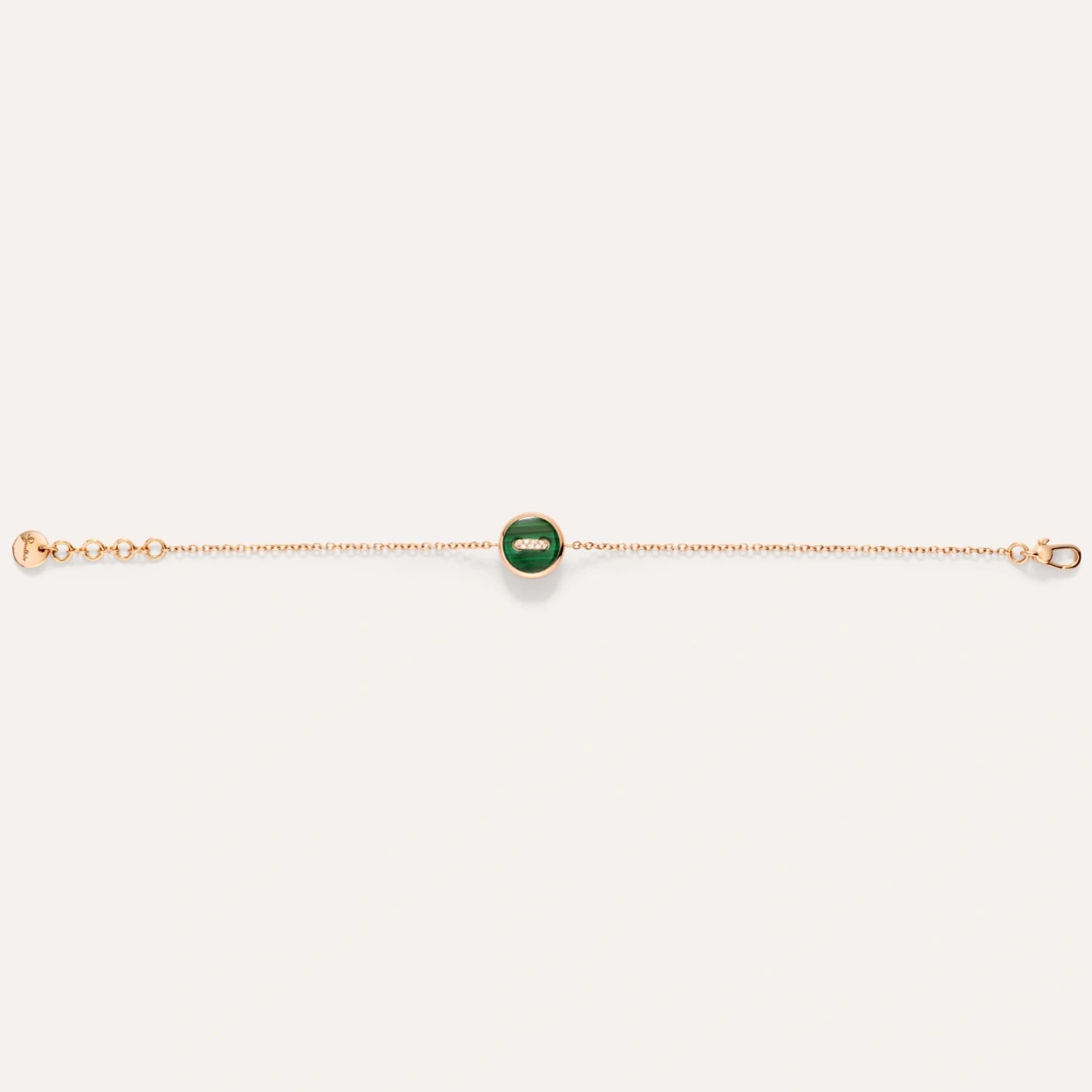 Браслет из розового золота 18K. Регулируемая длина цепочки. Двусторонний кулон - с одной стороны малахит весом 1,5 ct, с другой стороны натуральная перламутр весом 1,1 ct. Общий вес бриллиантов составляет 0,03 ct.