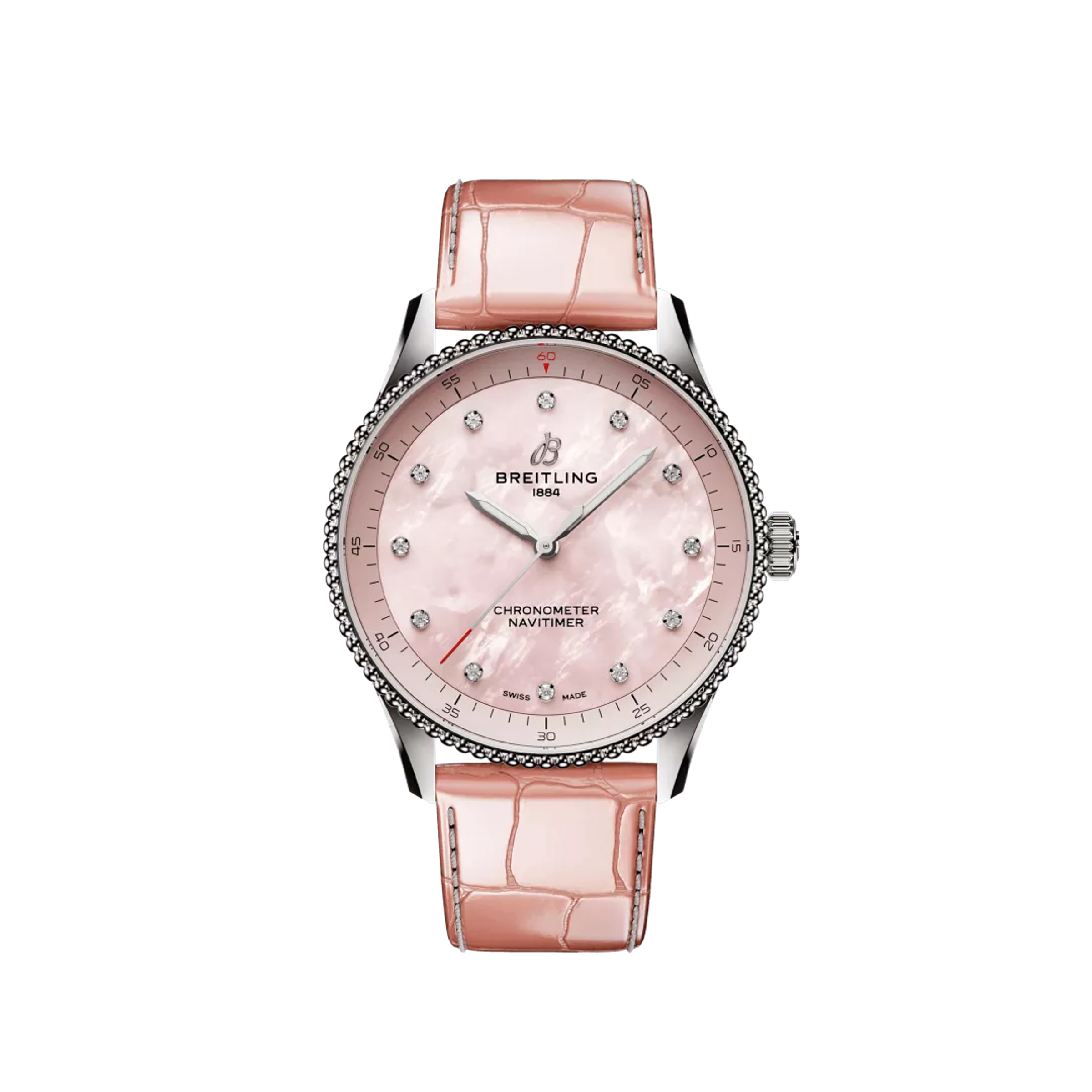 Женские стальные часы с кварцевым механизмом, диаметр 32 мм. Ремешок из аллигатора, шиповая застежка.