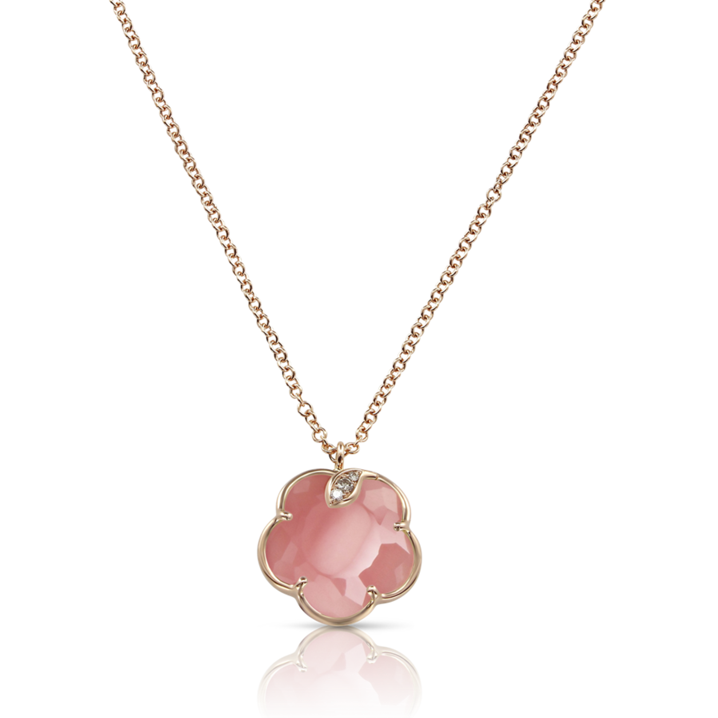 Ожерелье из розового 18K золота. Длина цепочки 42,5 см. Розовый халцедон в форме цветка размером 12 мм. Алмазы: белые - 0,01 карата, шампань - 0,03 карата.