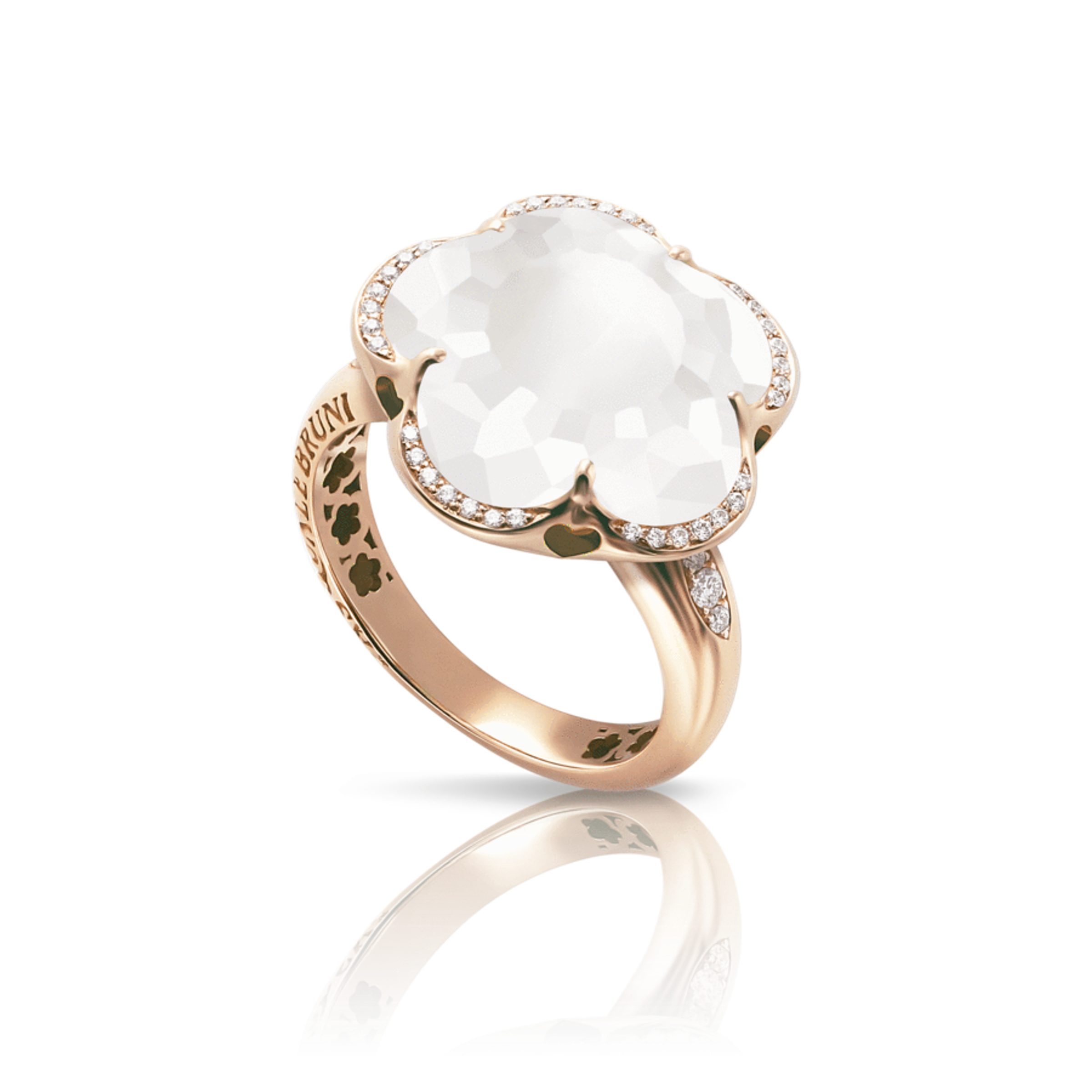 Кольцо из розового золота 18K. Молочный кварц в форме цветка размером 14 мм. Общий вес бриллиантов составляет 0,15 карата.