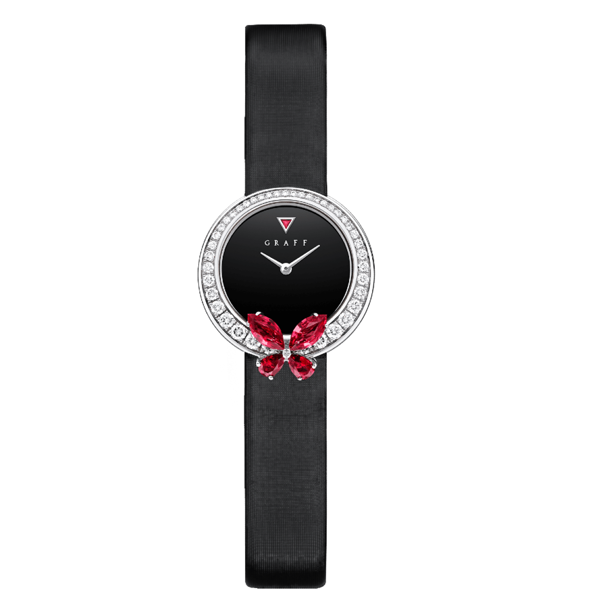 Женские кварцевые часы Graff. Корпус - белое золото 18K, 26 мм. Ремешок - сатин. Общий вес бриллиантов - 1,10 карата F VS+. Общий вес рубинов - 1,5 карата.