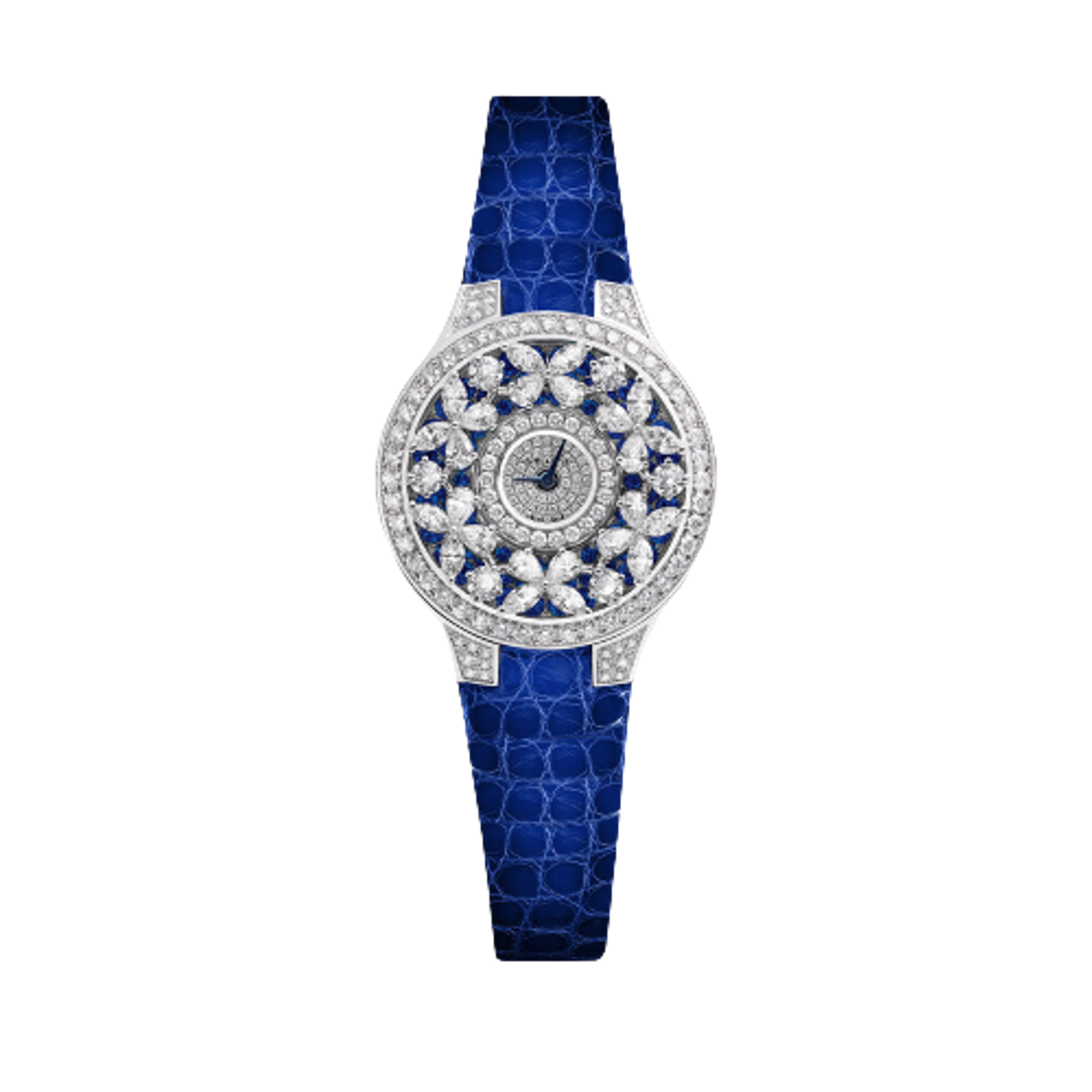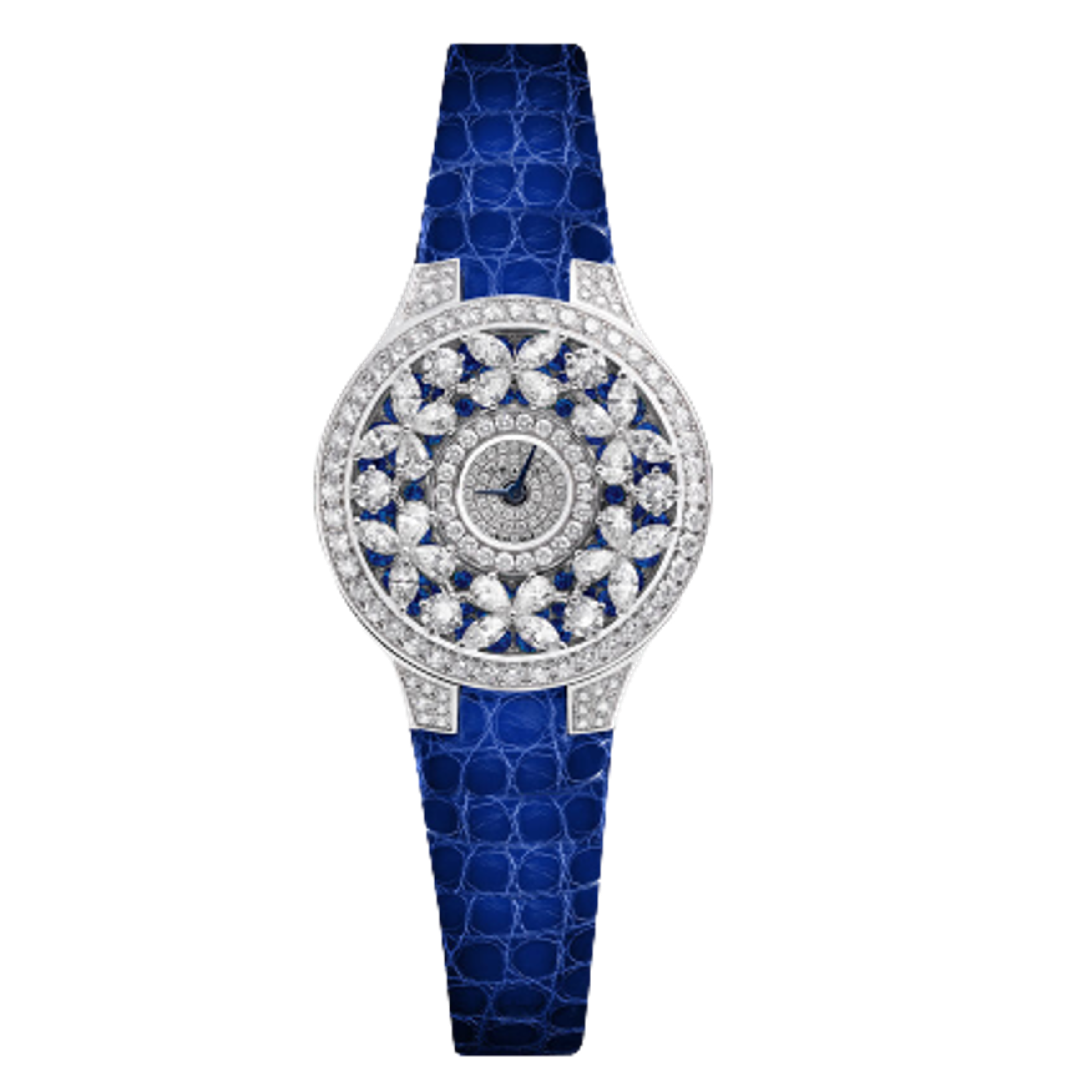 Женские кварцевые часы Graff. Корпус - белое золото 18K, 32 мм. Ремешок - аллигатор. Общий вес бриллиантов - 7 карат. Общий вес сапфиров - 1,3 карата.